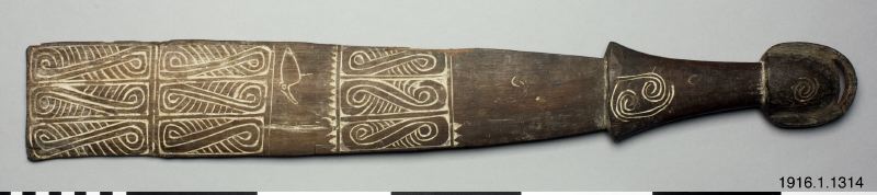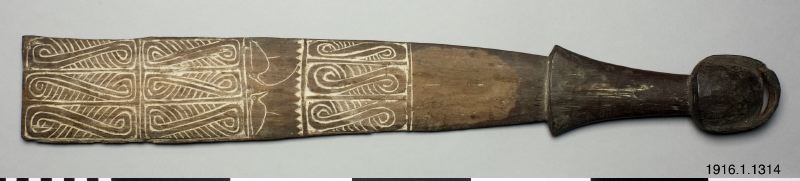 • Svärdsliknande klubba av mörkt trä. Har snidat handtag med parerskydd och inskurna dekorationer. Längst ner på bladet, inristade fåglar cirklar spiraler och kurviga ornament ifyllda med kalk. Sprucken längs med ena långsidan.
