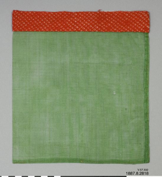 Mössa av grönt florstyg med kant av rött vattrat siden. /generalkatalog Påsformad, tyg av hår eller tagel bemålat med grön färg. Kant av sidentyg med prickar av knytbatik. /EM