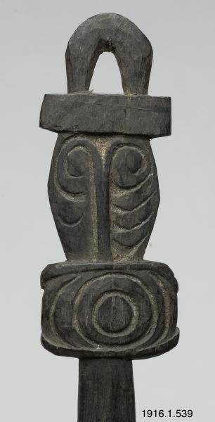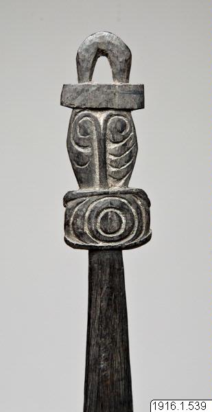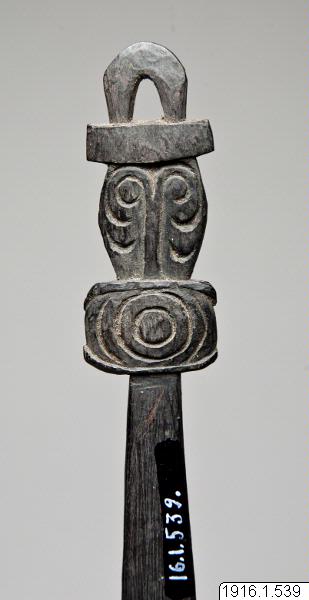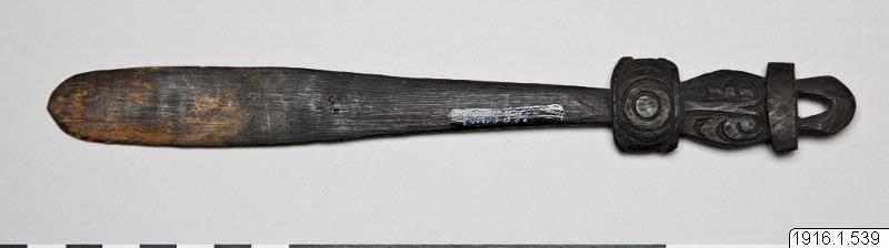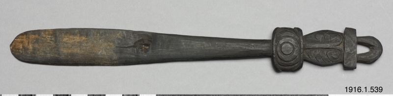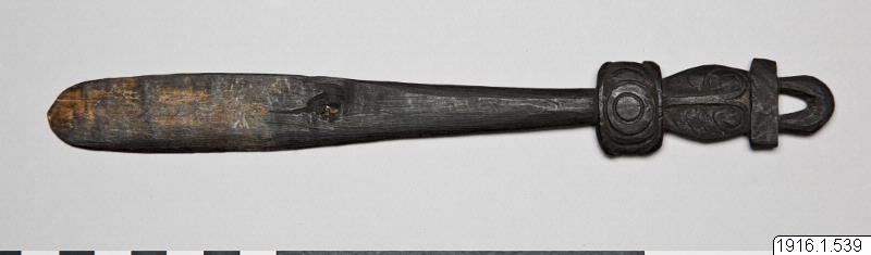Kalkspade av trä. Jmf. nr 522. Liten, platt, Det ornerade skaftet slutar i en utskuren ögla. Längd 23 cm, Bredd 2,6 cm. [ocr]