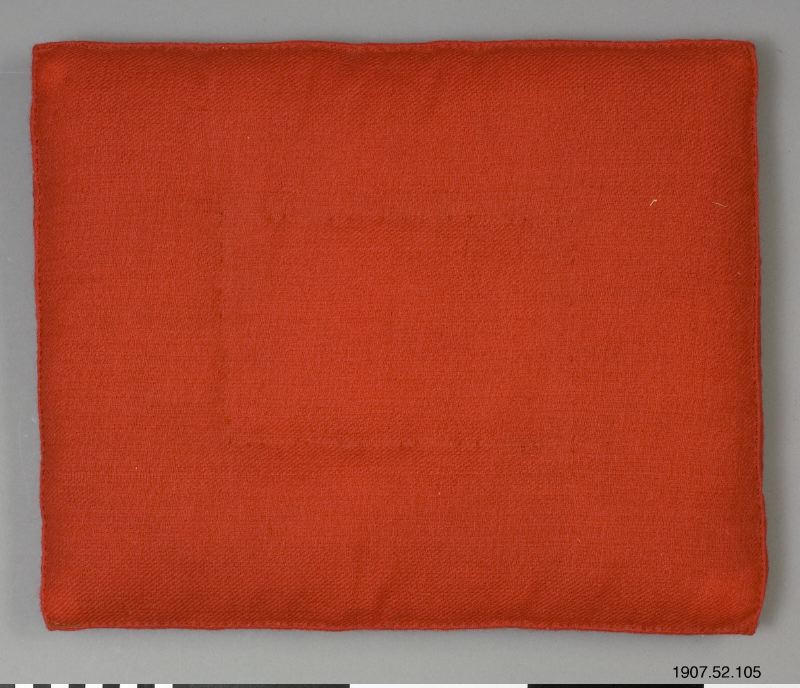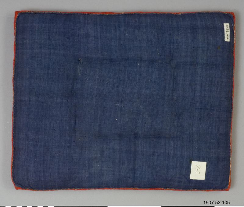 • Stoppad rektangulär kudde. Ovansida av röd yllekypert, fodersida i blå tuskaft. Ett antal genomgående stygn i en centrerad rektangel.