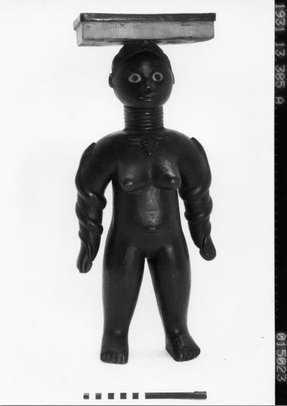 Föreställande kvinna med offerbössa, skrin med löst lock, på huvudet. Armarna omslingrade av ormar. Höjd: 66 cm. Torde härstamma från konno norr om kissi och ha tillhört det föga kända orm-sällskapet....