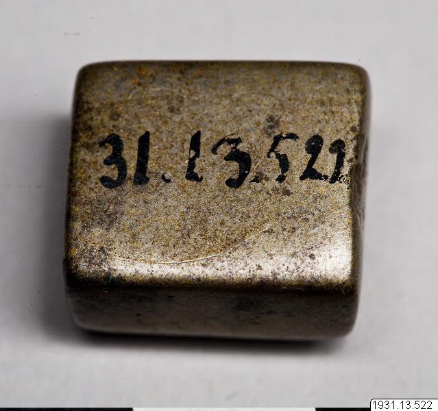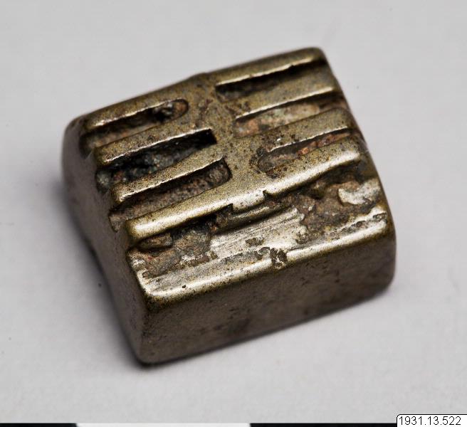 • Guldvikt. (Enligt generalkatalogen). Rektangulär. Mönster i relief på ena sidan.