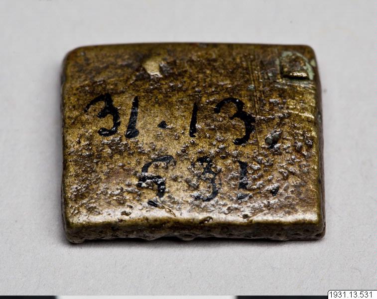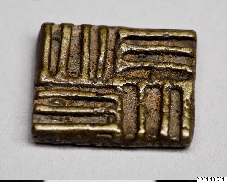 • Guldvikt. (Enligt generalkatalogen). Rektangulär. Mönster i relief på ena sidan.
