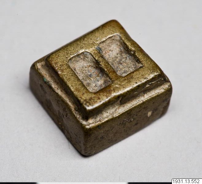 • Guldvikt. (Enligt generalkatalogen). Fyrkantig. Mönster i relief på ena sidan.
