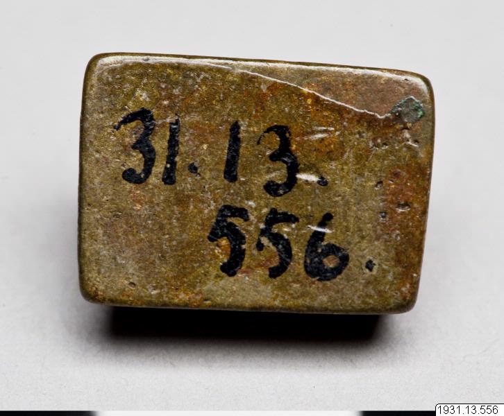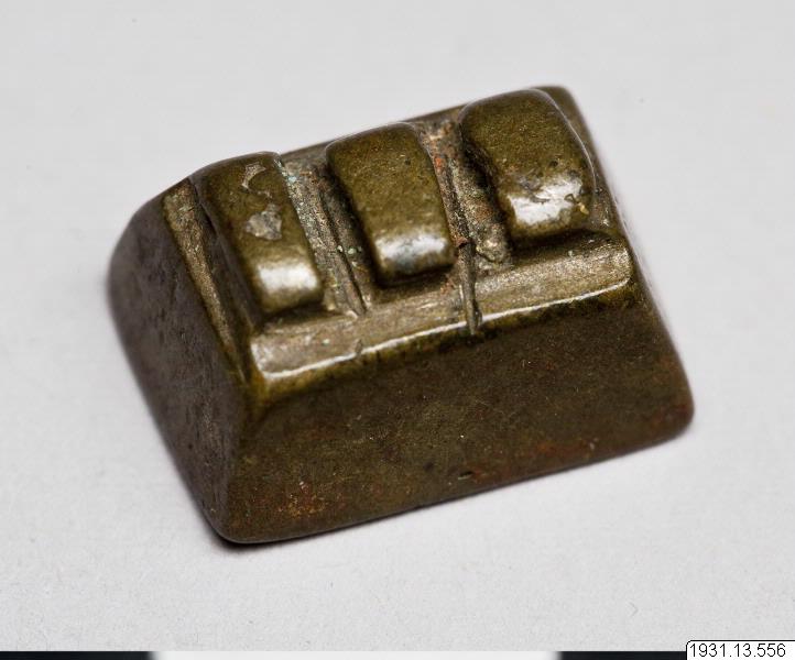 • Guldvikt. (Enligt generalkatalogen). Rektangulär. Mönster i relief på ena sidan.