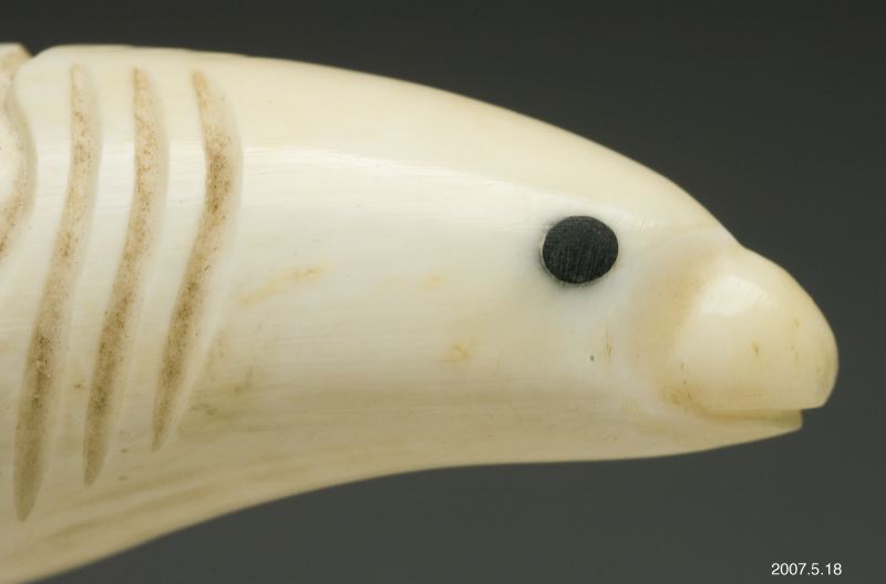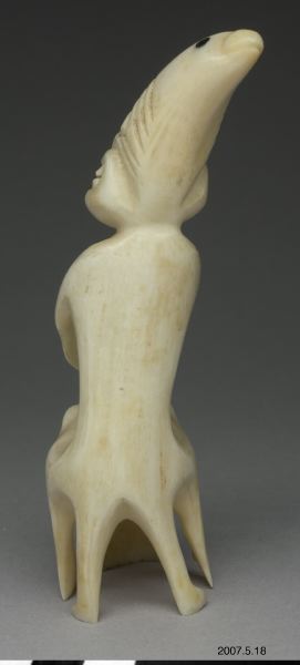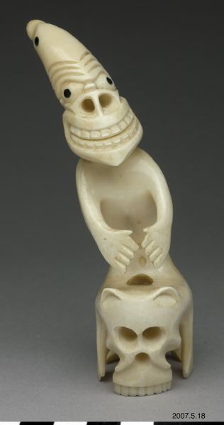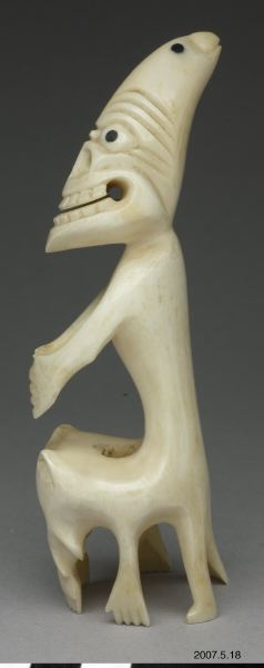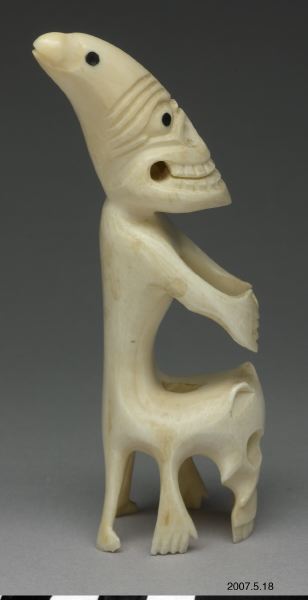 Skulptur av elfenben (?), troligen en tupilak. Stående figur vars nedre del är sammanfogad med en fyrfotavarelse med dödskalleansikte. Huvudet något på sned, avslutas med ett djurhuvud (säl?). Figuren har ett brett leende och uppspärrade näsborrar. Ögonen ifyllda med svart.