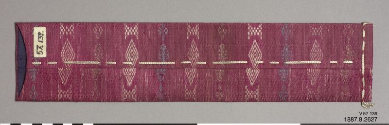 Fodral för heliga skrifter. Av enkelt mönstrat siden, blekt. /generalkatalog Platt violett fodral med öppning i kortsidan. Dekorationssnodd trädd längs sömmarna. Fodrad med violett siden. /EM