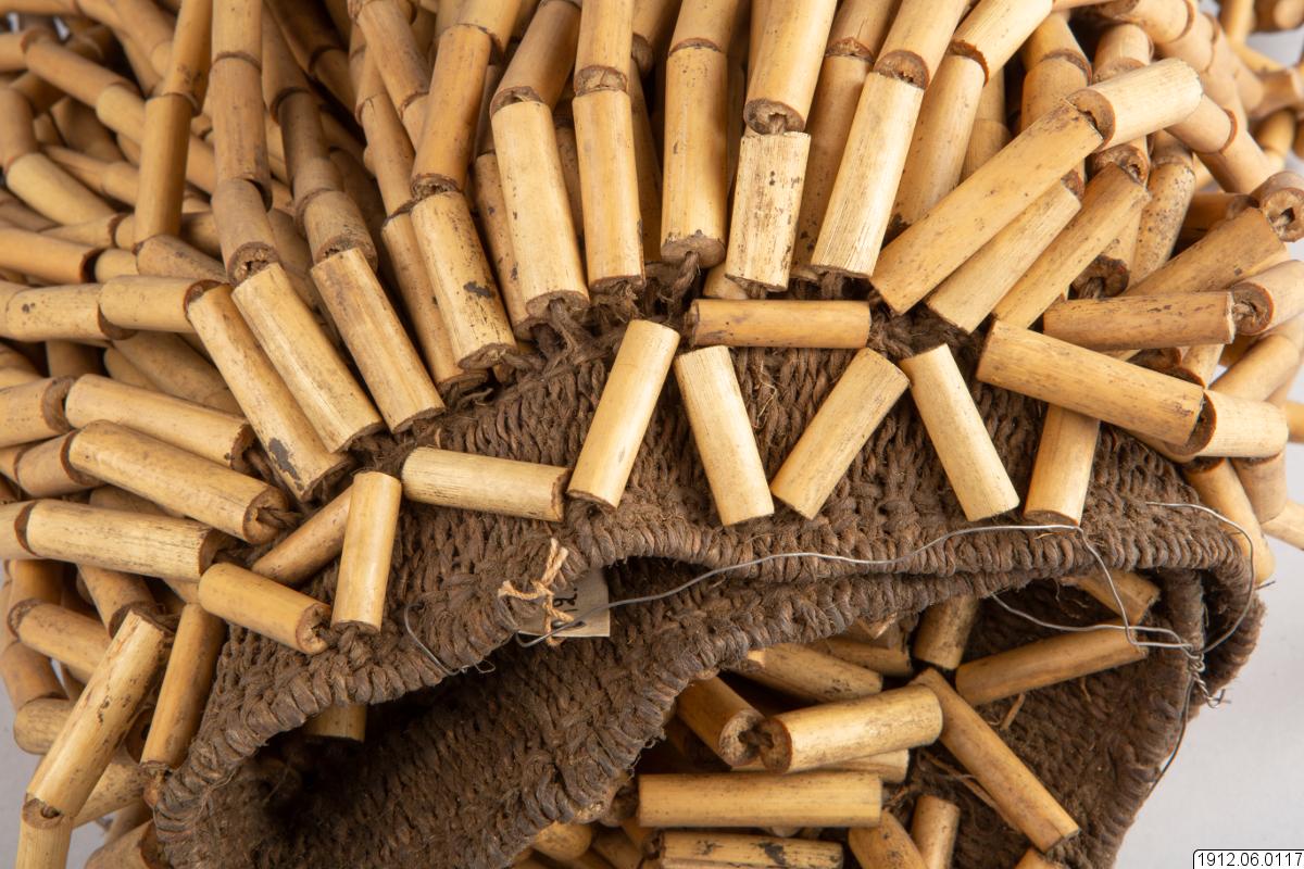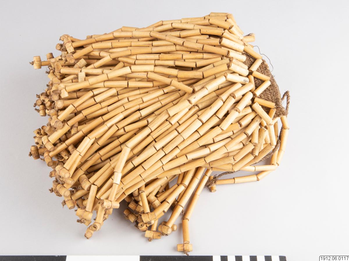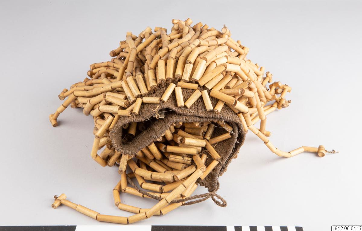 "The dances of the Balenge people are similar to those I have previously described from the people of Bangveolo, as is clear from the following description from my book From Cape to Alexandria: “During our stay in the village of Chirukutus, the full moon occurred. Already a few days before, when the moon rose in its red splendor over the forest, the drums began to beat and the dance to thread. We go to the huts, from where the sound is heard. Facing the radiant disk of the moon, two youngsters stand leaning forward, each with a cylindrical, meter-high drum between his knees. Rhythmically and with a never-failing technique, they strike with their hands on the drums, one of which sounds four whole tones louder than the other. The interplay is without hesitation and the dull, mysterious tones of the drums seem almost hypnotic even to us whites. To the left of the drums in a semicircle stand a flock of women, most with their children tucked between their coats and backs. The semicircle on the right consists of men and boys. So a man and a woman run towards each other during steps, which are reminiscent of stepping, although here also added strong movements with the hips. All the others clap their hands in time to the muted rhythm of the drums. The dance lasts only a few seconds, the woman runs back to the group of women, the man to the other men. A new couple then immediately dances out, and then one couple replaces the other throughout the night. Sometimes the musicians tune a monotonous, melancholy song, which in certain places is amplified by the chorus of the others. The dance is getting wilder and wilder. The little linden children's heads toss and nod in time with the movements of their dancing mothers, but not a sound is heard from the little vomits, who with a satisfied expression observe the strange spectacle. When we return to our tents, the drums sound just as loud, and when we are tired we fall asleep, the melancholy song still reaches our ears. " Ballet women sometimes wear dance belts. These consist of an ear part of fibrous yarn, from which a number of strings with threaded pipe or saw sticks hang down (Fig. 343)." (pp. 419-420, von Rosen, 1916, translated from Swedish).
