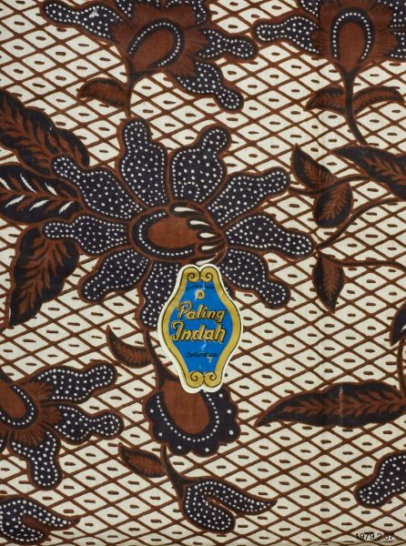 Stormönstrat tyg i brun batik. På tyget finns etiketter påklistrade med texten ¿Paling Inda¿.