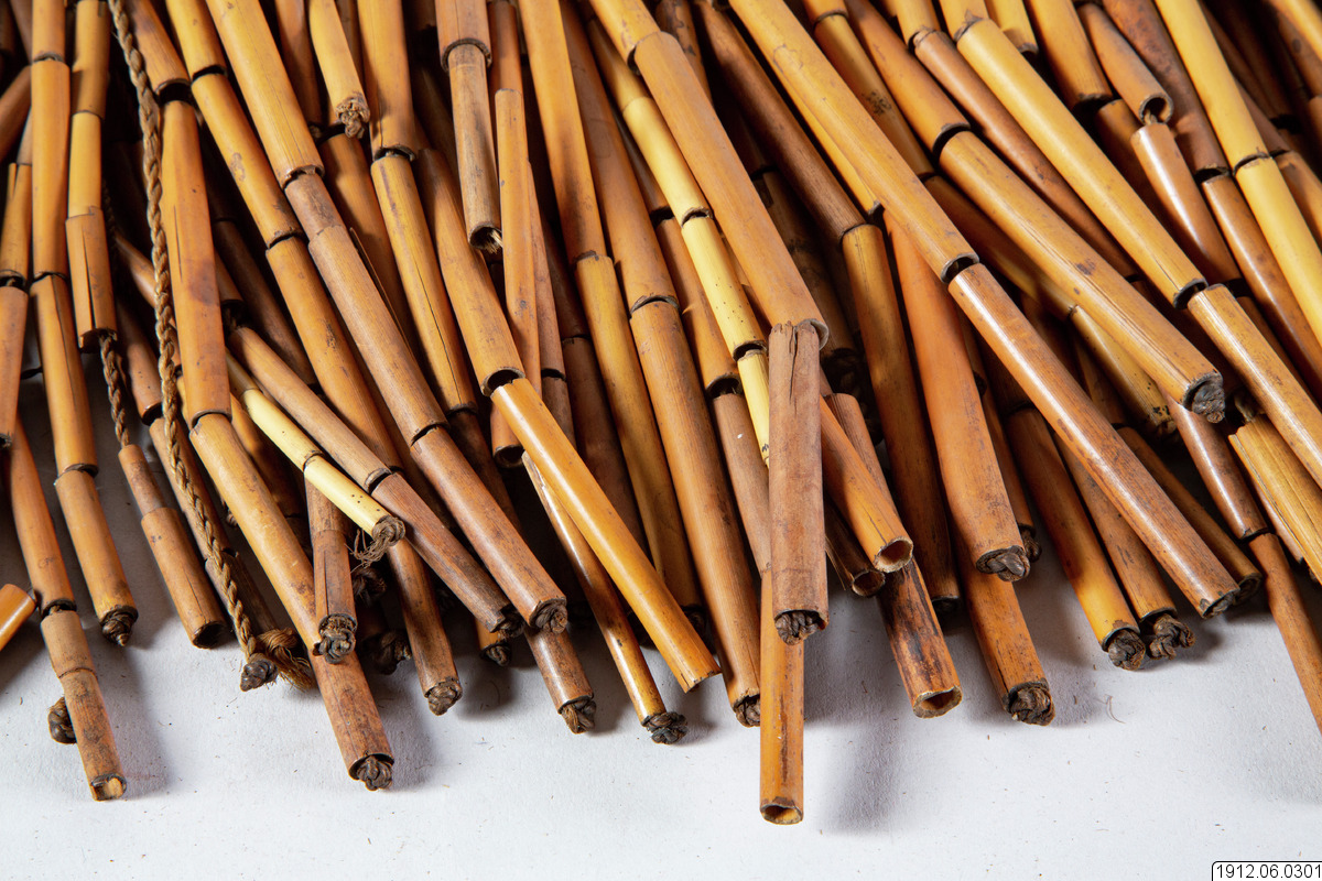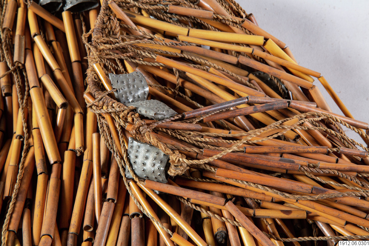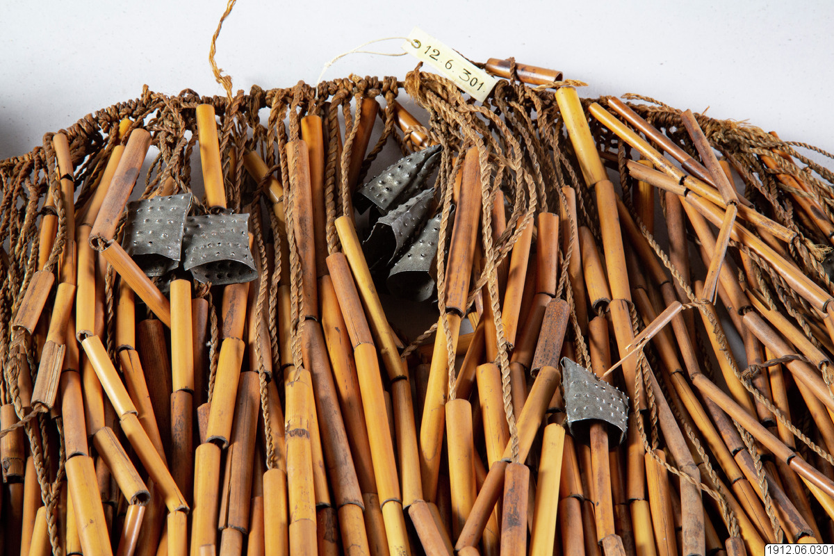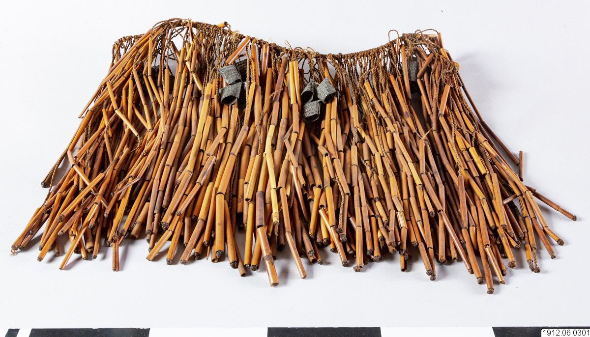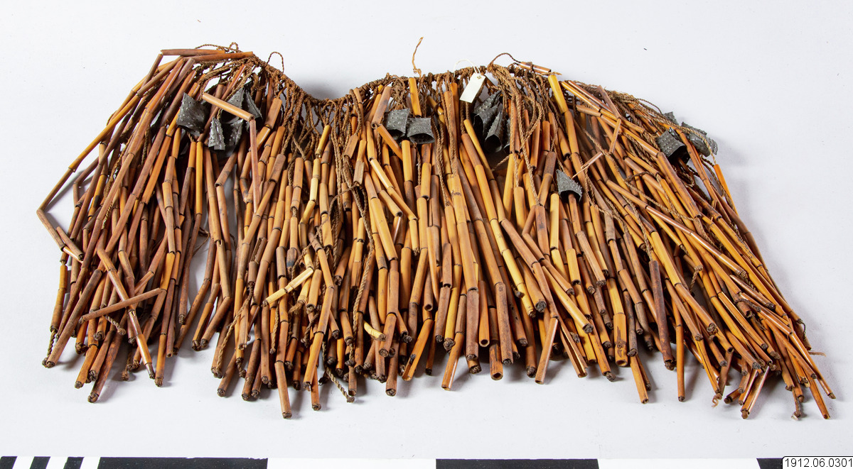 • Enligt generalkatalogen: Dansbällte av på fibersnören uppträdda små rörpinnar. Fyra knippen av bjällror av bleckplåt.
