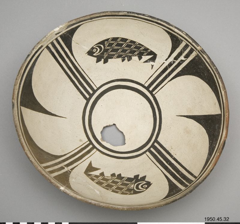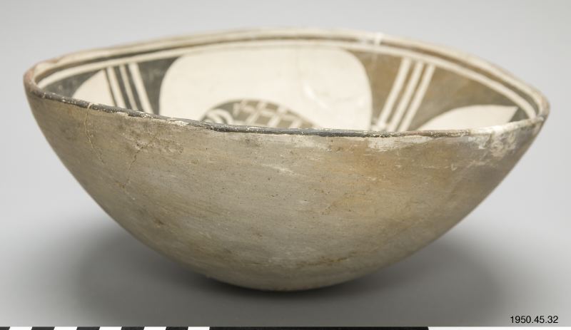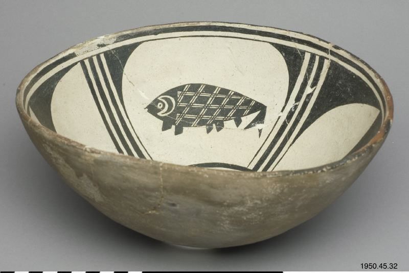 Klassiskt mimbre "black-on-white" kärl. Botten rundad och mynningen vid. Insidan dekorerad i fyra fält, i två av fälten finns en fisk avbildad, i de andra två svarta fält. Fälten avdelade med parallella streck, ca 1 cm breda. Funnen på en typisk Mimbres site, tre mil söder om den svarta ruinen? (the Swarts Ruin). Kärlet placerades över skallen vid en vuxenbegravning. Ett sekundärt hål i botten av ...