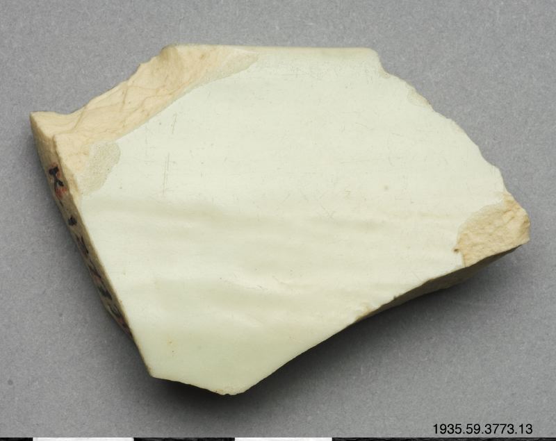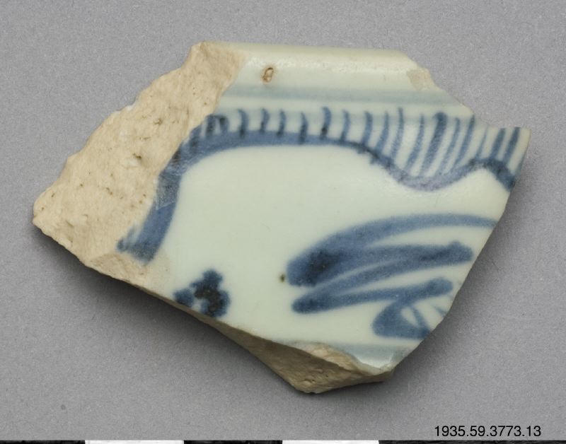 • Två små kantbitar av ett större kärl av porslin. Vitblå glasyr med mörkblå mönster på utsidan. Tjockväggigt. (katalog)