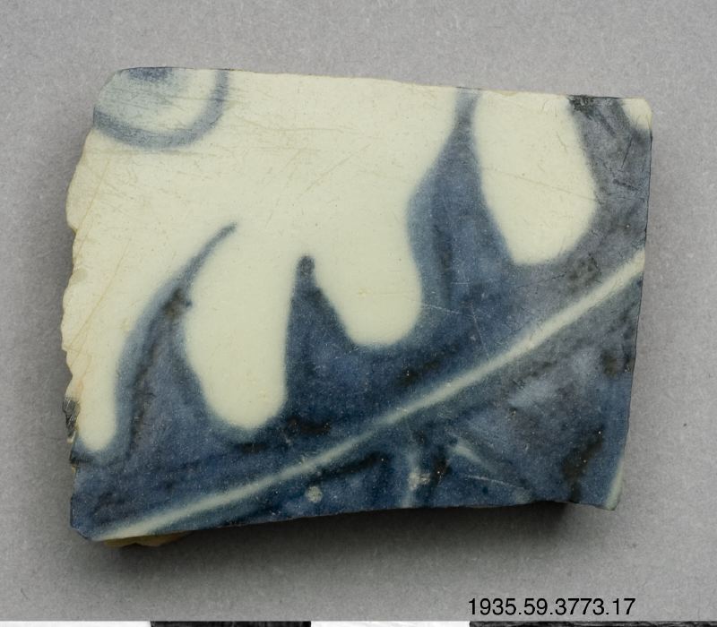 4 skärvor (14-17) av ett tjockväggigt, större kärl av porslin, möjligen hophörande med 12-13. Vitgrön glasyr med en stor, kraftigt tecknad drake i blått på utsidan. (katalog)