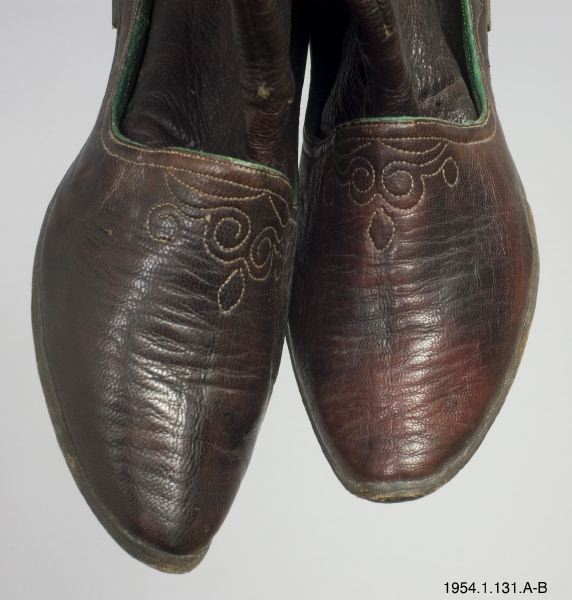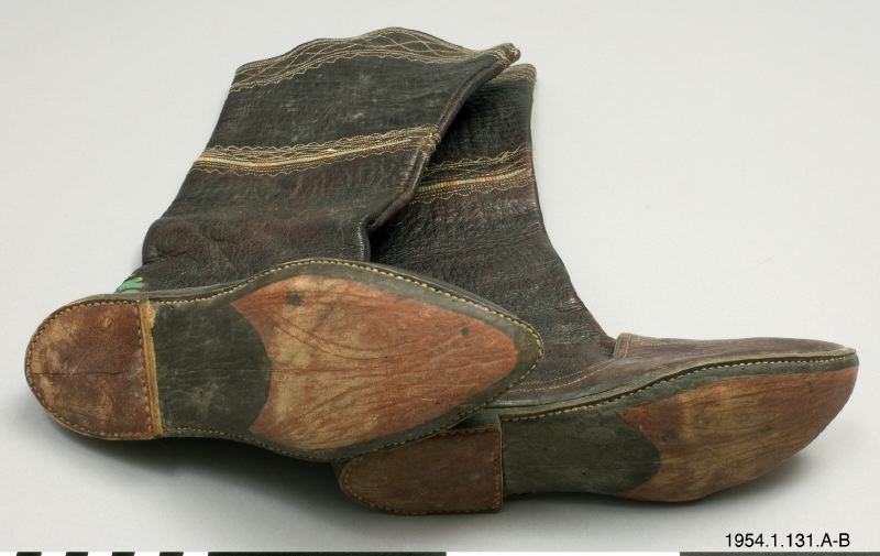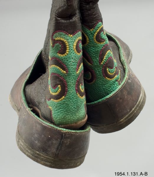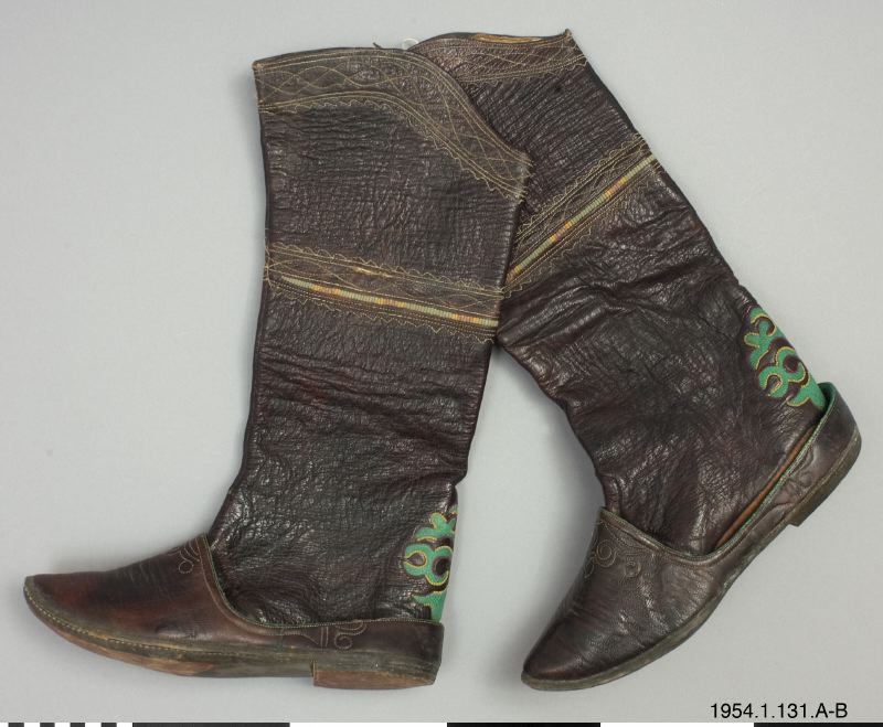 • Ett par skinnstövlar med avtagbara galoscher. Dekorerade med stickningar i rött, grönt och gult.