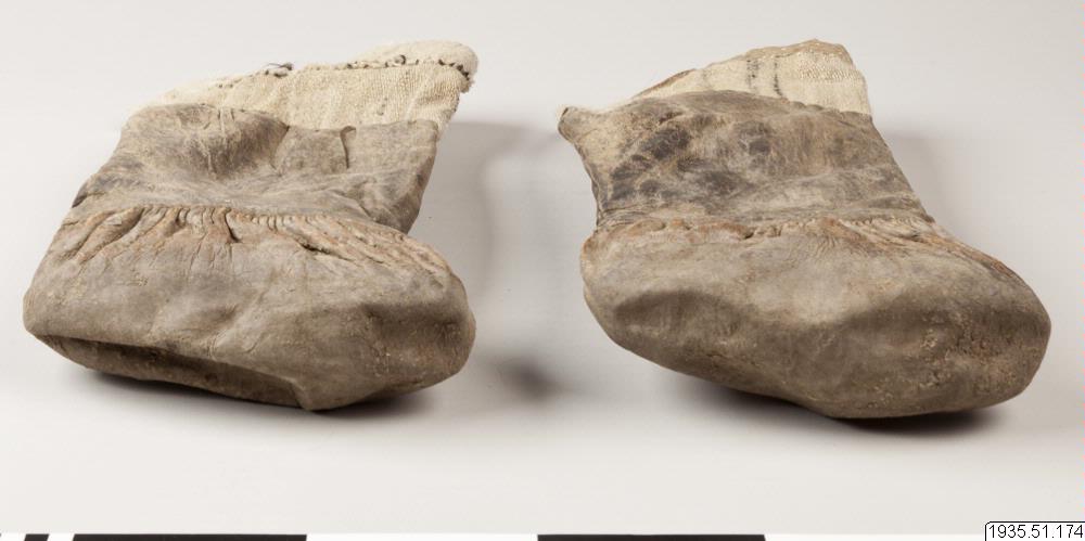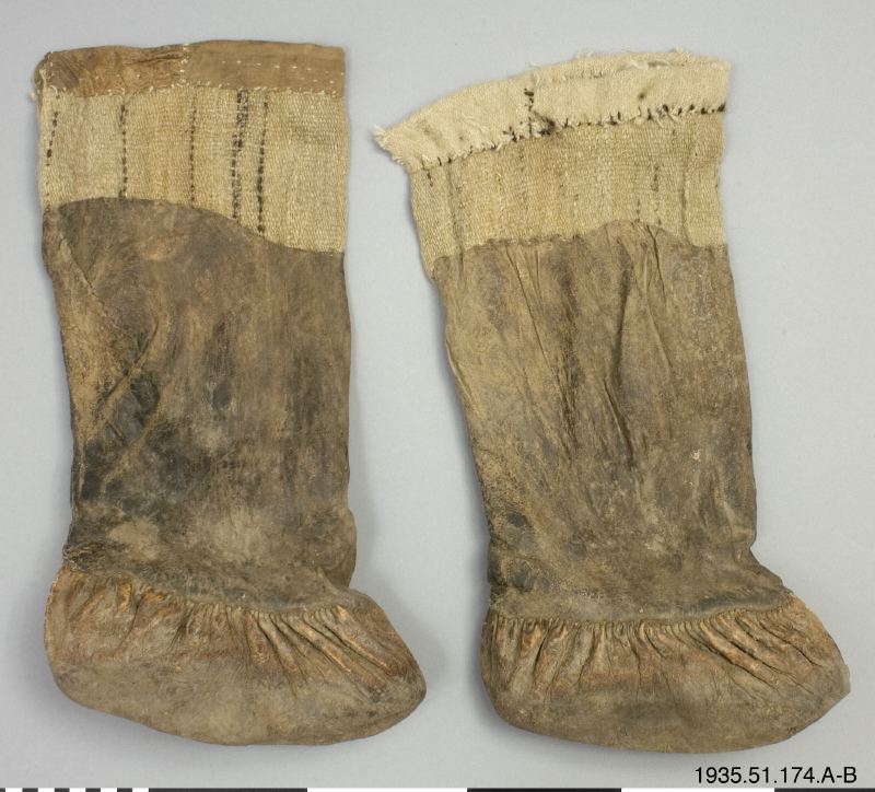 Ett par handsydda stövlar av skinn och ylle. Fot och skaft av skinn, fodrade med ylletyg i tuskaftsväv, som når en bit upp ovanför det mjuka skinnskaftet. Ena skon kantad med bomullstyg. Se även nr 173.