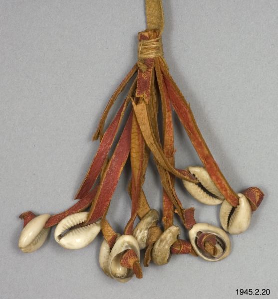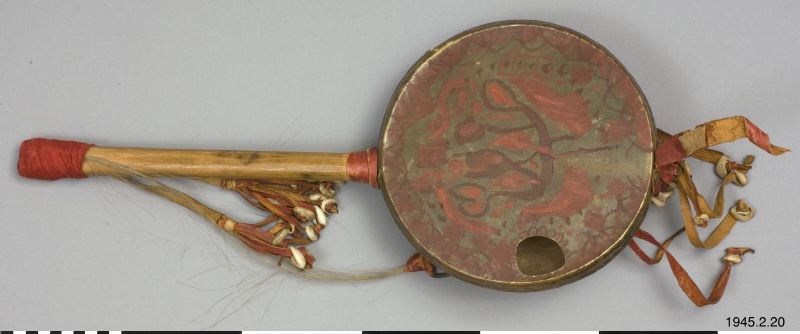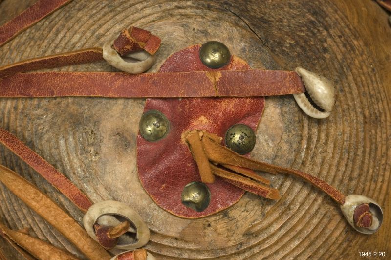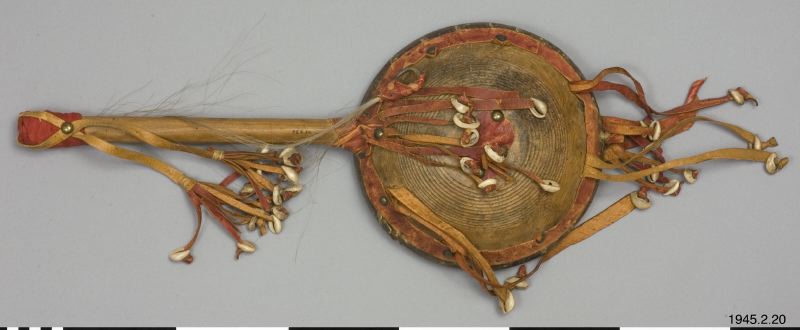 • Stränginstrument, spjutiga, rebab, (fig. 11) med en sträng och försedd med stråke. Den halvklotformiga resonanslådan är gjord i ett stycke och överspänd med tarmskinn. Membranen är prydd med streck och blad, målade i två nyanser rött Resonanslådans baksida är prydd med inskurna, koncentriska cirklar. I mitten ett ovalt, ca 6 cm brett rött läderstycke fastsatt med mässingsnitar och försett med fyra... Visa hela