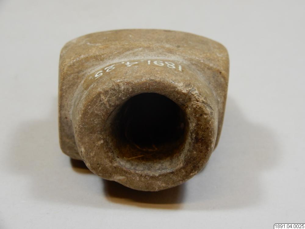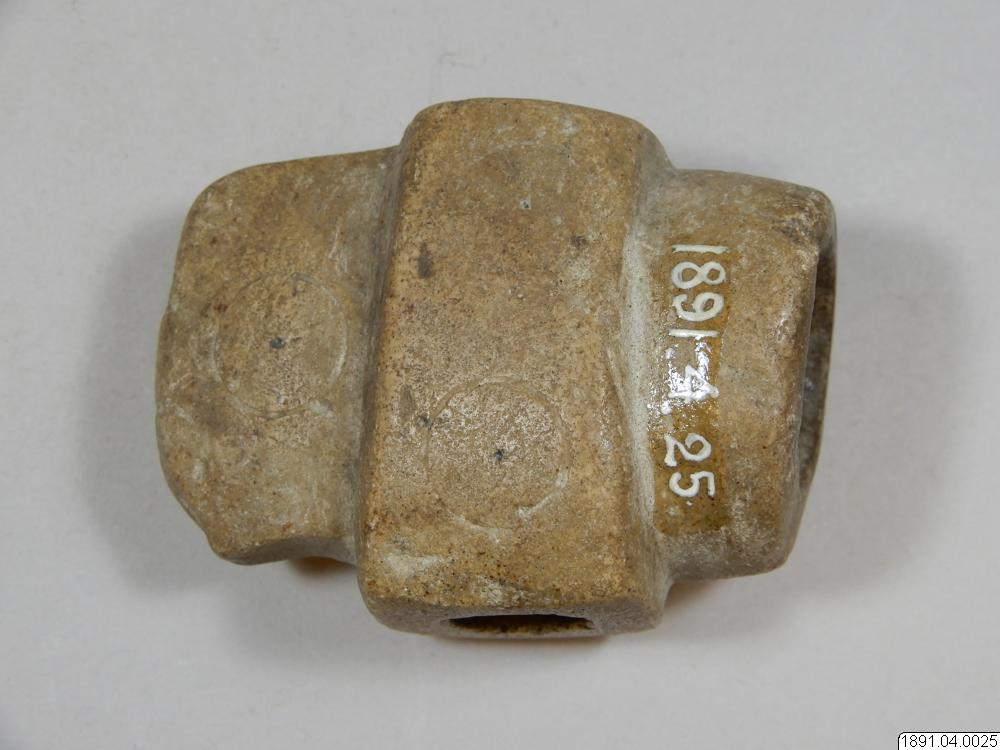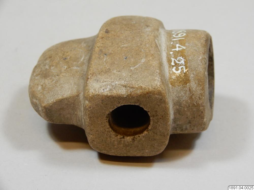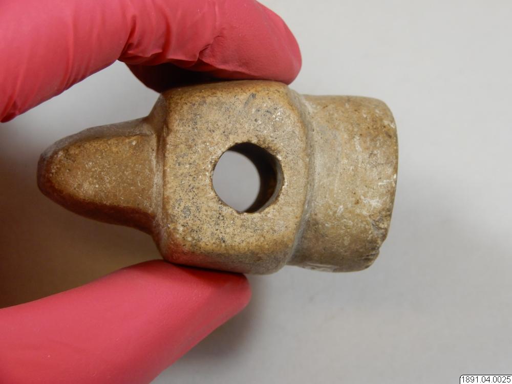 Tobakspipa. Lik en yxa. Tobaksfånget i bakre delen. Mittpartiet utgörs av ett upphöjt tvärband på var sida prytt med två cirklar. Sådana förekomma också på bladet. Mittpartiet genomborrat.