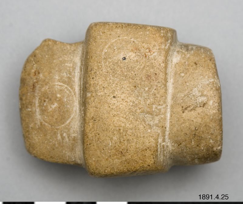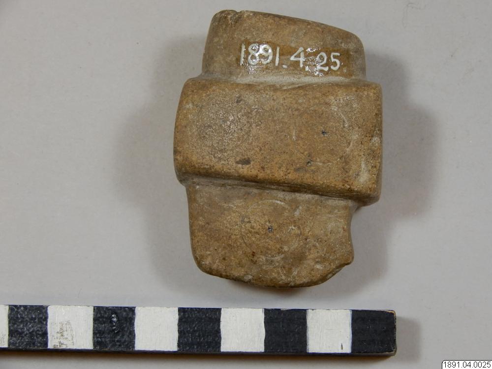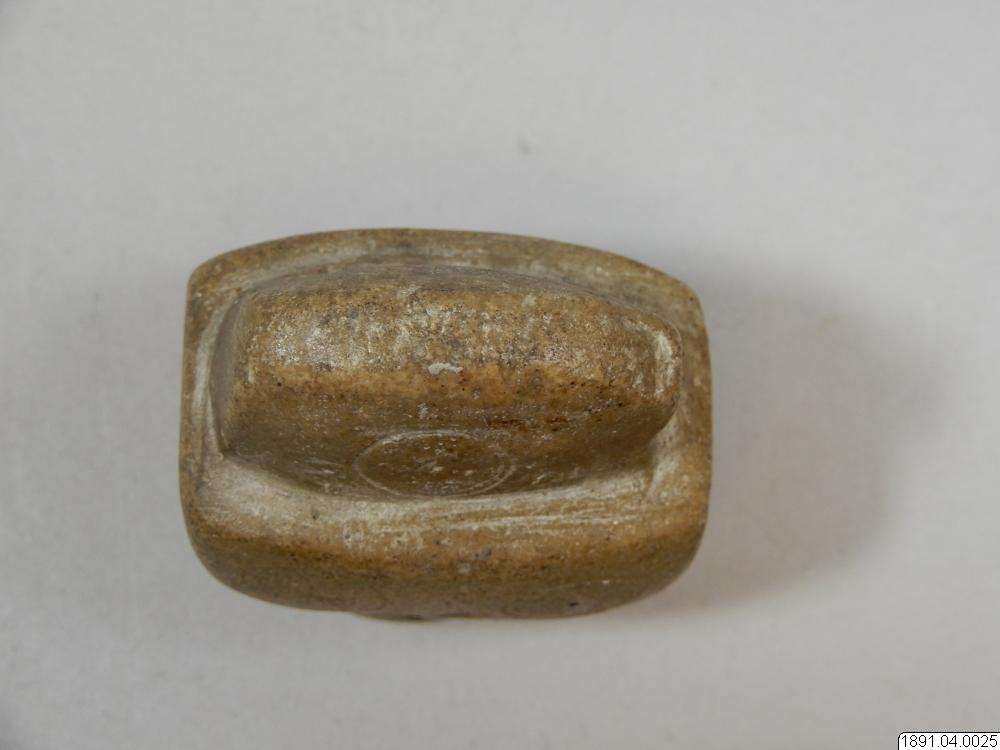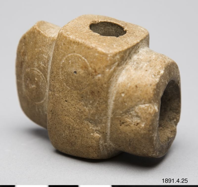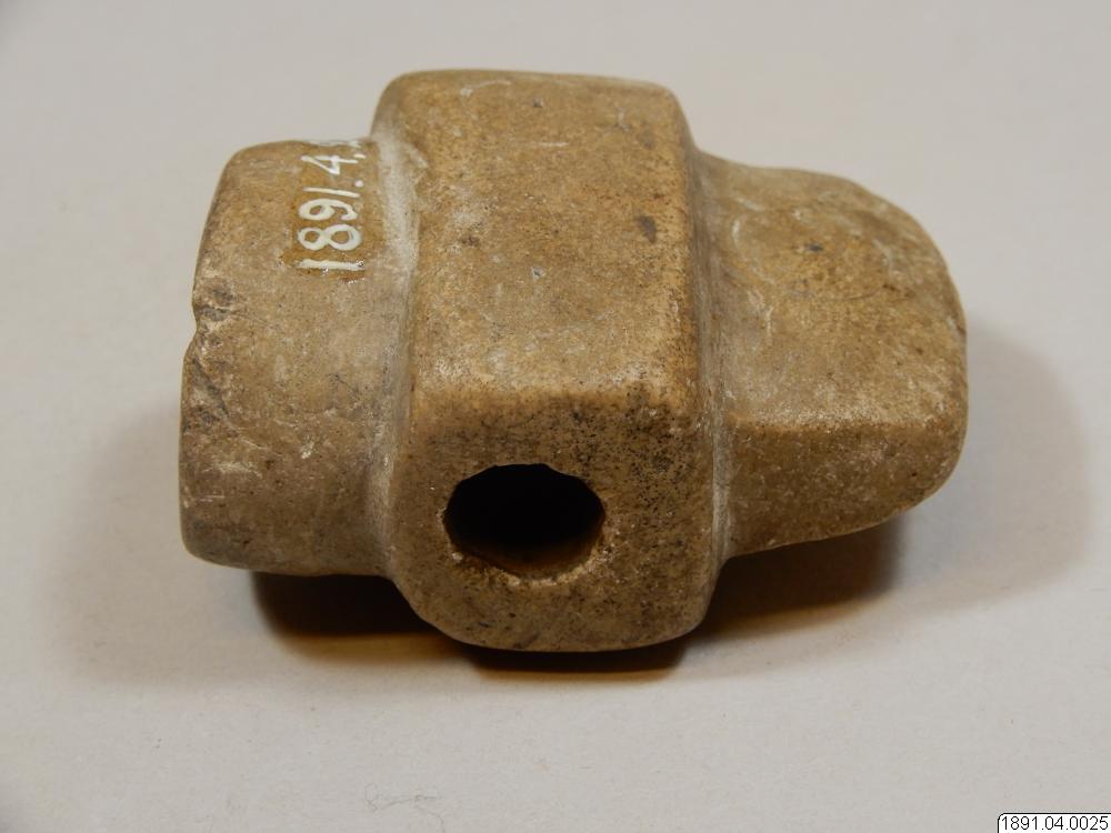 Tobakspipa. Lik en yxa. Tobaksfånget i bakre delen. Mittpartiet utgörs av ett upphöjt tvärband på var sida prytt med två cirklar. Sådana förekomma också på bladet. Mittpartiet genomborrat.