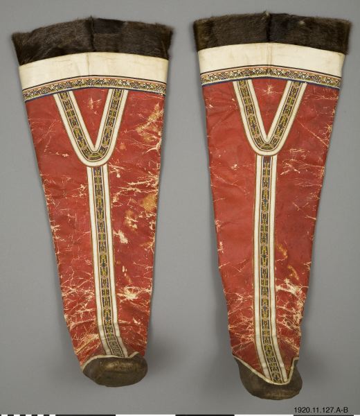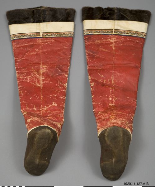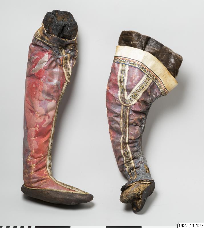Stövlar, kamiker, par, för kvinna. Hör samman med nr 123. Av rött skinn med mosaikbroderier. Dubbla, det inre paret av ogarvat sälskinn.