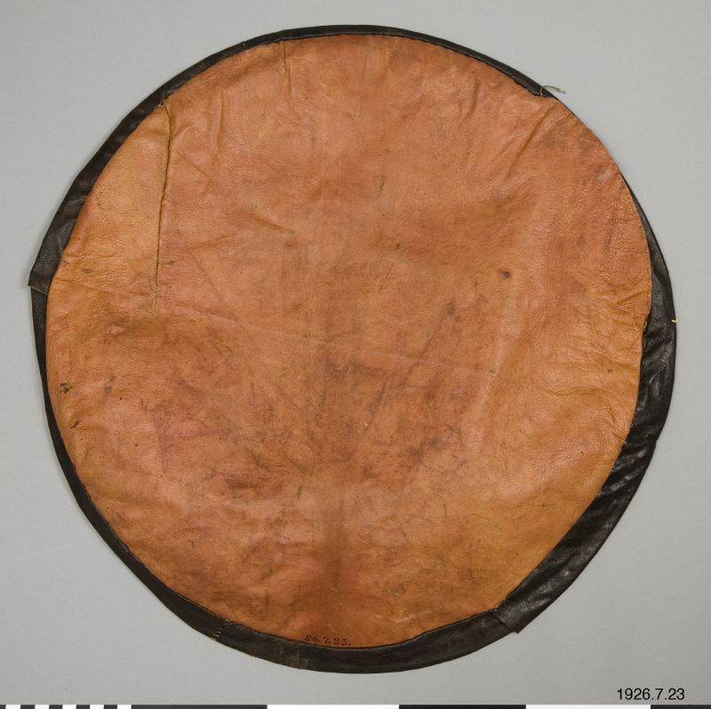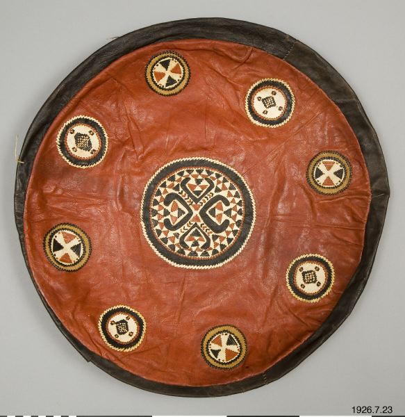 Rund kudde av rödbrunt läder med svarta kanter och på översidan runda applikationer i vitt, gult, rödbrunt och svart, en större i mitten, omgiven av åtta mindre. Ej stoppad. Ytterligare information finns i generalkatalogen.