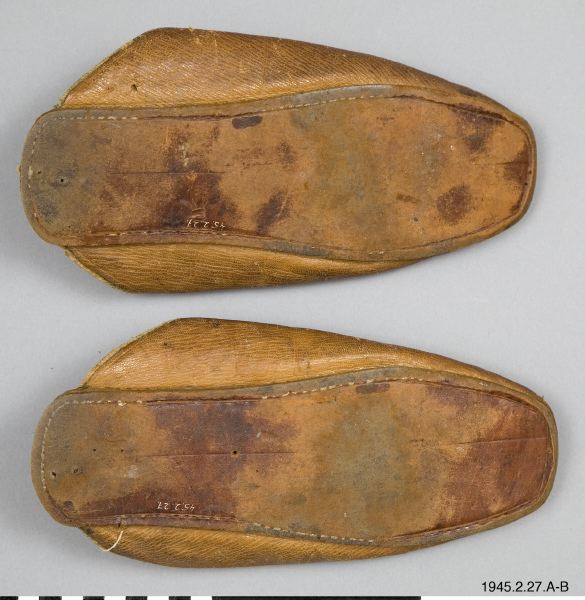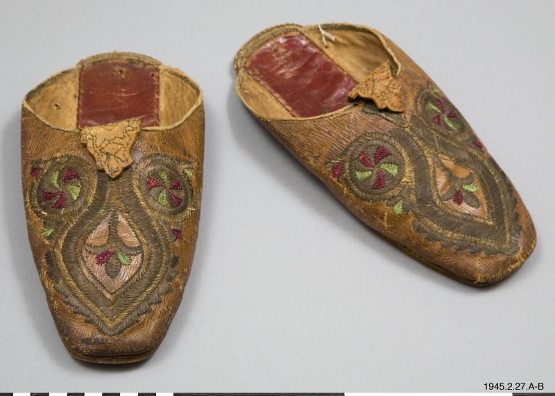 Damtofflor av brunt läder med broderier i guld, grönt och rött samt med läderapplikationer (fig.17). Liknande tofflor avbildade Henri Terasse och Jean Hainaut i Les Art Décoratifs au Maroc, 1925, p. 95. (generalkatalogen)