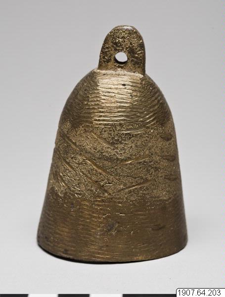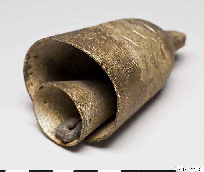 Klocka för får. Gjuten av mässing. Konisk form, svagt oval mynning. Ögla på den plana ovansidan. Inuti klockan en liknande mindre sådan med kläpp. (Enligt generalkatalogen).