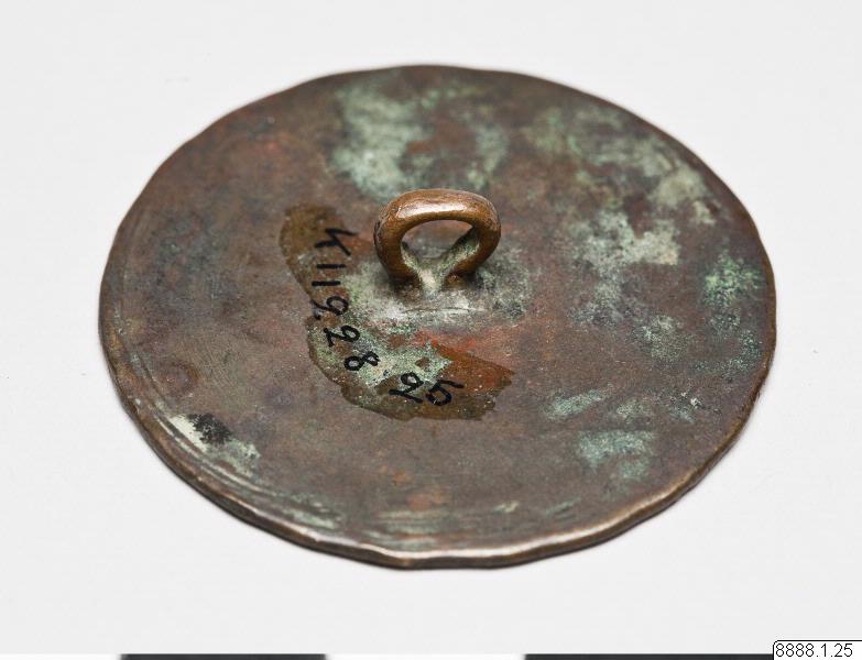 • Rund knapp med ögla på baksidan. Framsidan dekorerad med stämplad dekor.