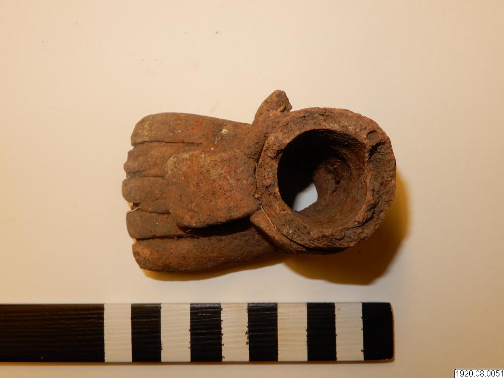 Fot till mänsklig figur = sandal, vilkens knytband går mellan tårna upp till kappans vristrem. Undersidan ihålig. Sandaltyp, jfr Inv.11.579; Tzendal-Tsotsil i Chiapas. Längd 8,7 cm. Höjd 5,6 cm. (Mexiko?)