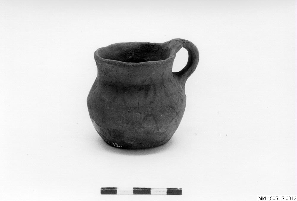 Kruka med ett otydligt ornament, liten. Grovt, brunt gods. Bukig form, plan bottenyta och utsvängd mynningskant. Ett'vertikaltöra utgår från mynningskanten. 'Målad dekor i . svart, Höjd 6,5 cm. Max.diam. 7 cm. Mynn,diam« 6 cm, Chuli [ocr]