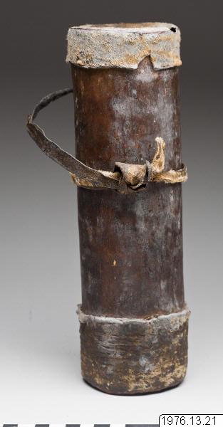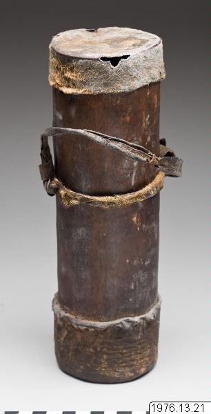 Urholkade träbehållare med botten av påkrympt läder. Stödjande läderremmar runt behållerna. Har lock och bärrem av läder, rak form. Används för att förvara fårfett, eller, mer sällan, mjölk/blod. De större används till att hämta och förvara honumg i. Vanligtvis gjorda i Kolonroträ. Ur W. Östbergs texter om nr. 18-21