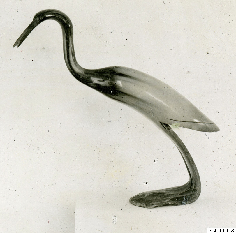 • Skulptur av fågel; häger. Tillverkat av horn som gjorts formbart genom uppvärmning. Vingarna markerade med en skåra, benen åtskilda men fötterna förenade i en bred platta. S-formigt svängd hals. (Enligt generalkatalogen).