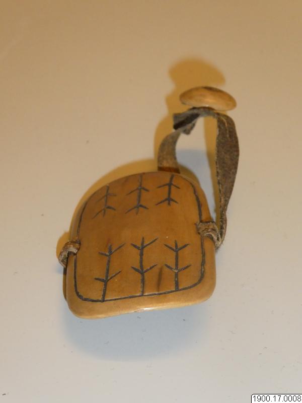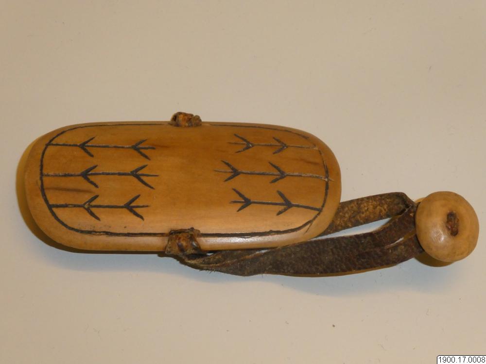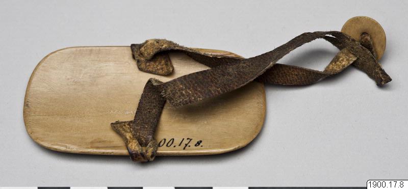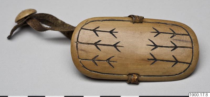 • Handskydd för bågskytt. Elliptisk platta av valrosstand med svarta ornament, skinnrem och knapp för fästande över vänster tumme. (generalkatalogen)