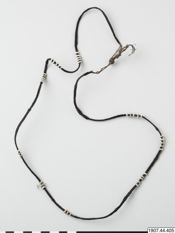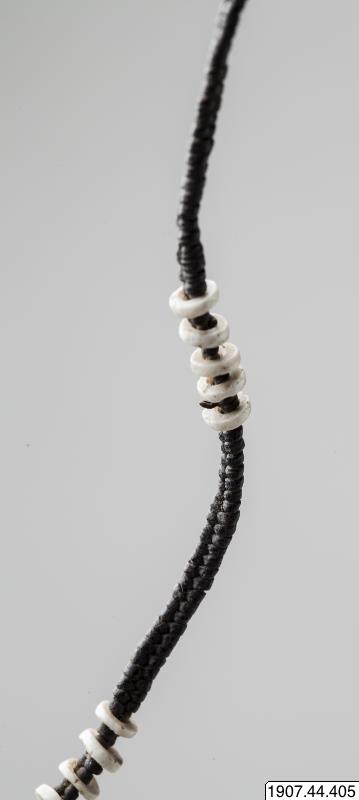 • Halskedja, flätad växtfiber prydd med skivor av snäckskal.