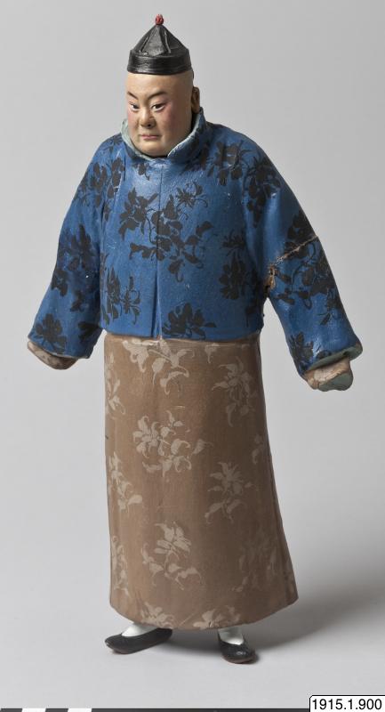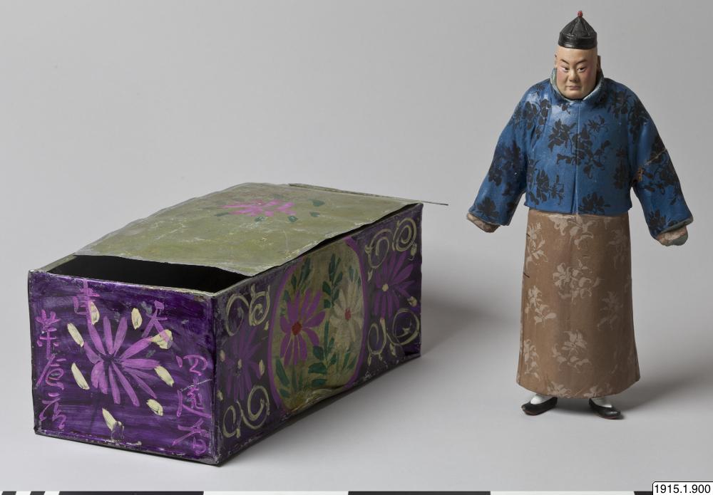 • Figur av lera, förvaras i en rikt målad plåtask med lock. Figuren föreställer en man klädd i brun kjol och blå jacka.