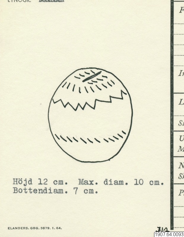 Utst.kat. nr 11, b) Sparbössa från Pnmegudta. Av ljusbrunt godse Bukig form9 plan topp och bottenytai inristad dekor. Höjd 12 cm. Max, diam.. 10 `cm. Eottendam. 7 me T49.11.tg_425.9.121212-J, [ocr]