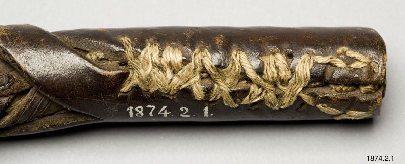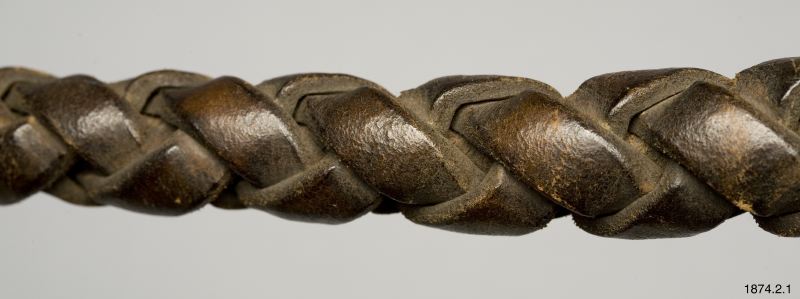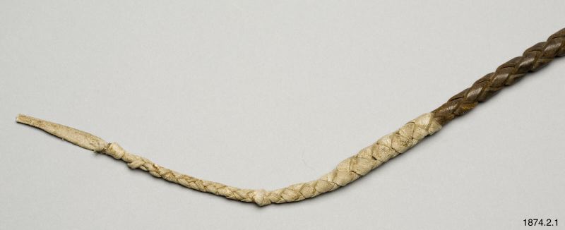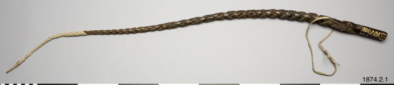 • Flätad av buffelhud. Har tillhört den bekanta indianhövdingen kapten Jack, som hängdes 1873, för delaktighet i mordet på general Canby och dr. Thomas. Modoc-indianer, Nord-Amerika. (generalkatalogen)
