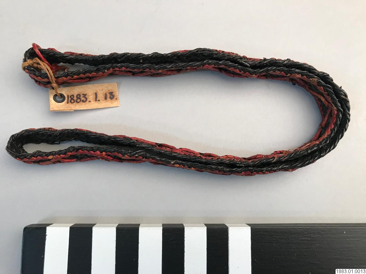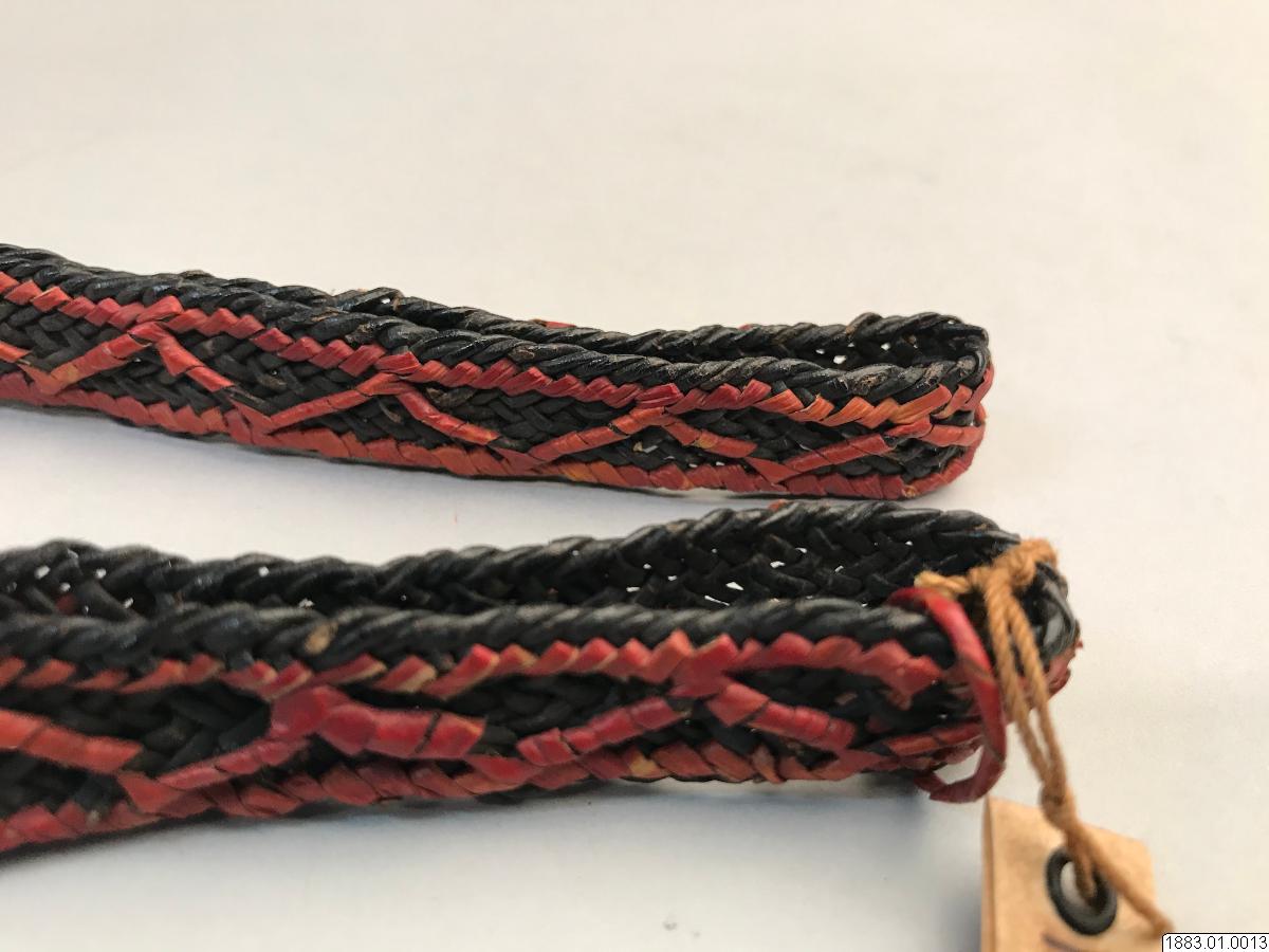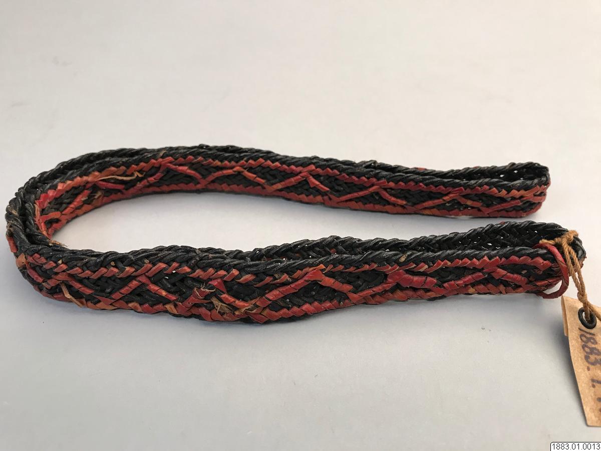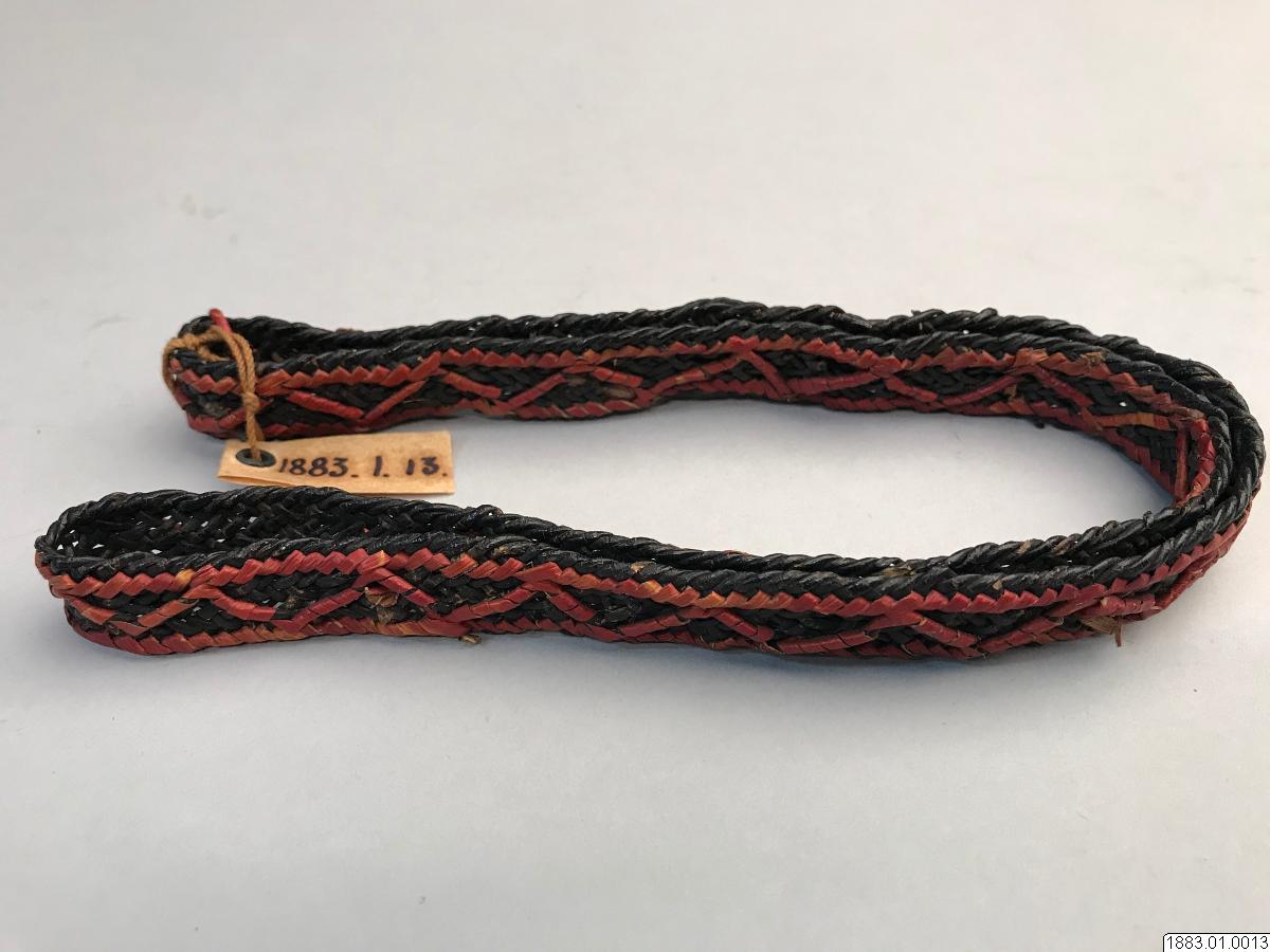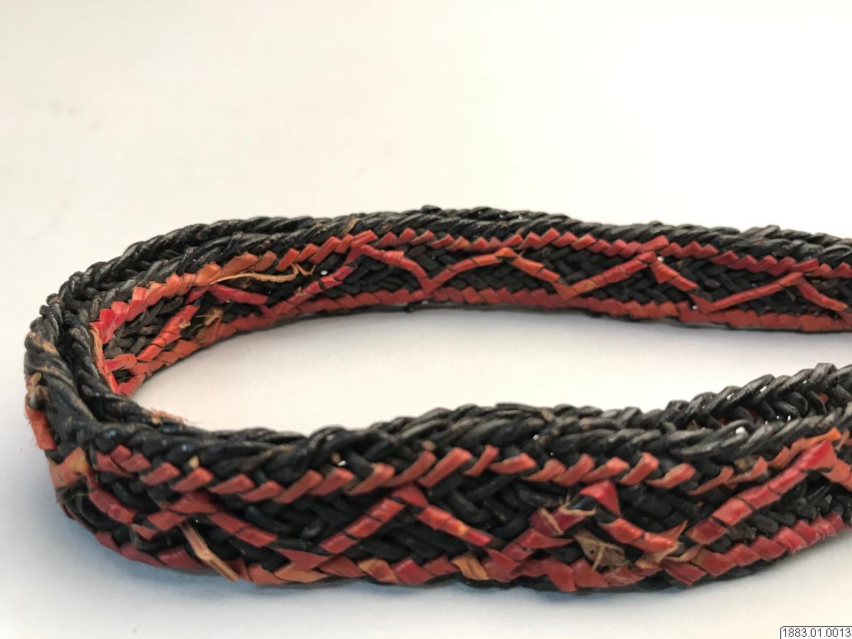 • Huvudsmycke, bandlikt, flätat av svartfärgade rör, prytt med röda ornament av samma material. [ocr]