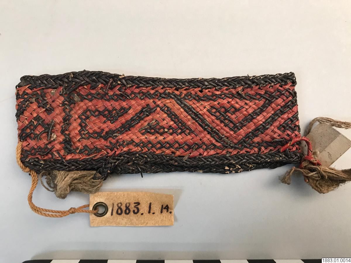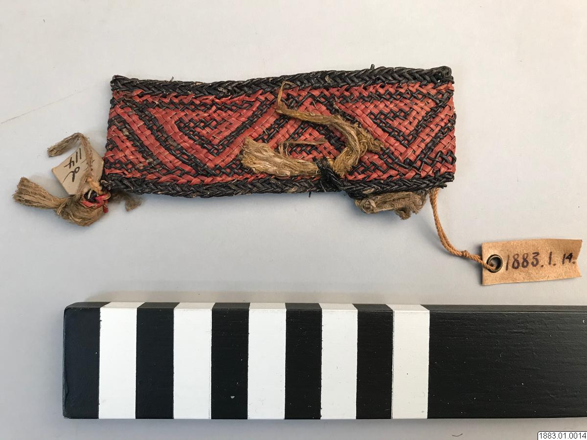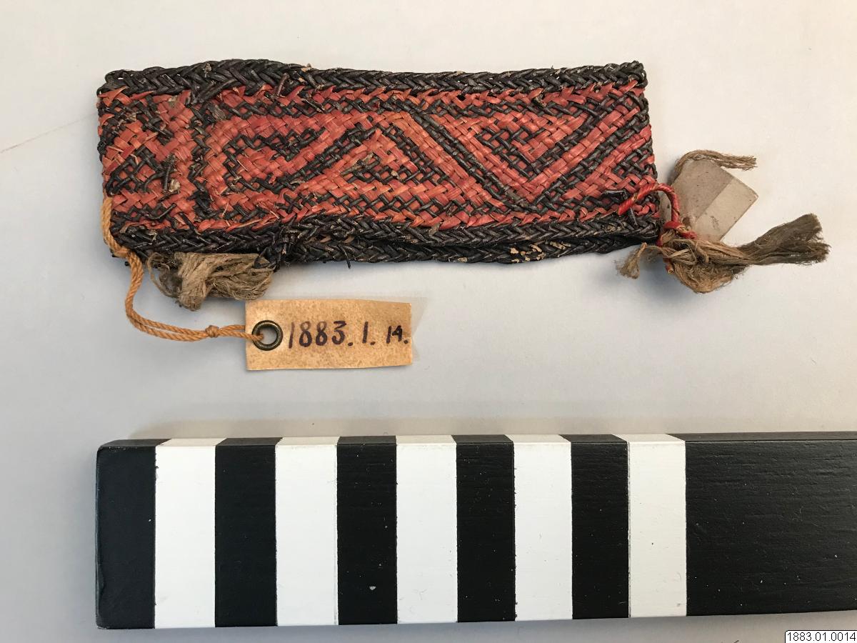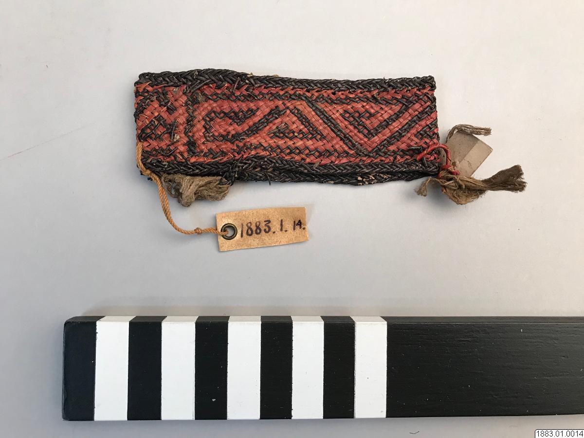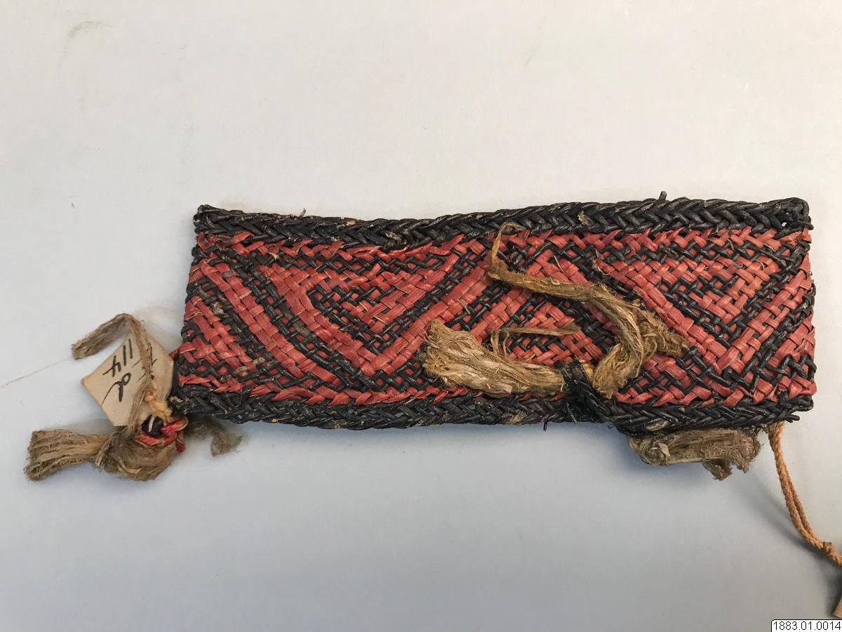 • Handledssmycke. Flätat av färgat rör i ornament (á la greque). Rött och svart och med gula basttofsar (Orig. nr. 2205) Vidd 20,5 cm. [ocr]