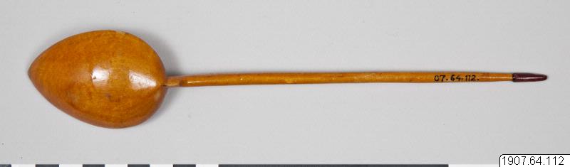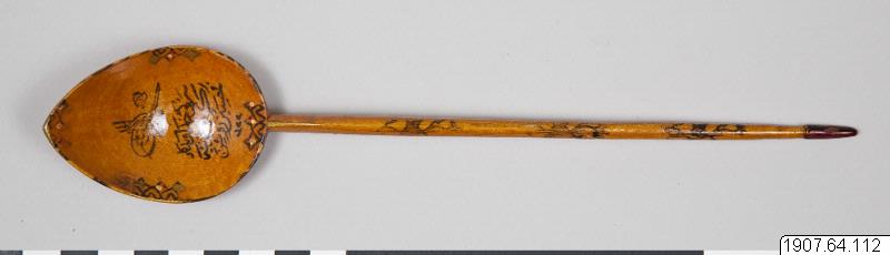 • Sked av trä av ljust gulaktigt trä. Fernissad och med målad dekor i svart och rött. (Enligt generalkatalogen).