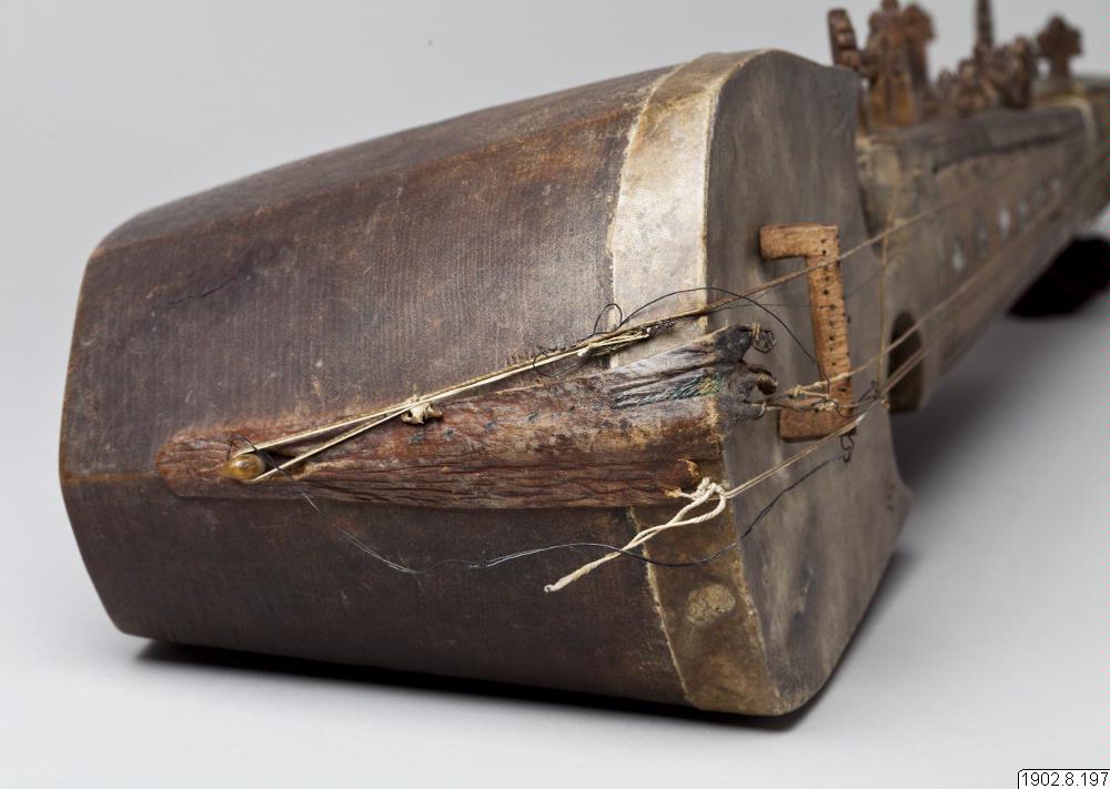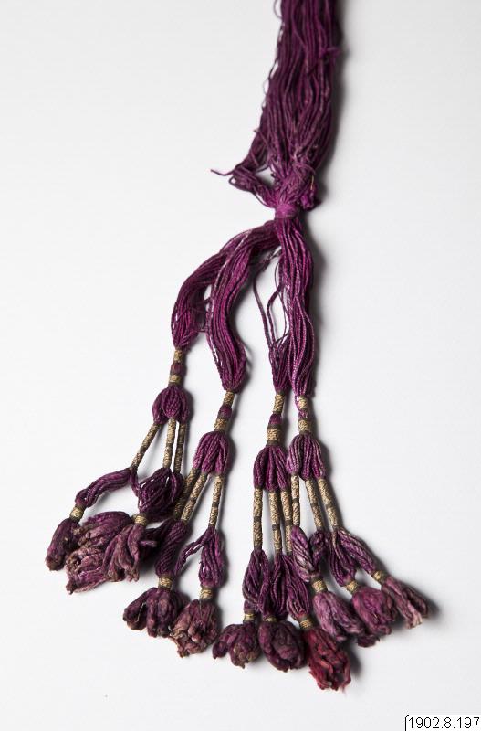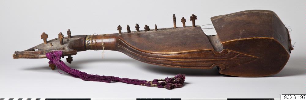 Mandolin med inläggningar av ben och pärlemor. Vidhängande en lång gredelinröd tofs, nedtill, genom guldtrådslindningar avdelad i flera smärre. Strängar av metall, senor och snören.