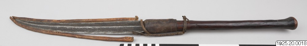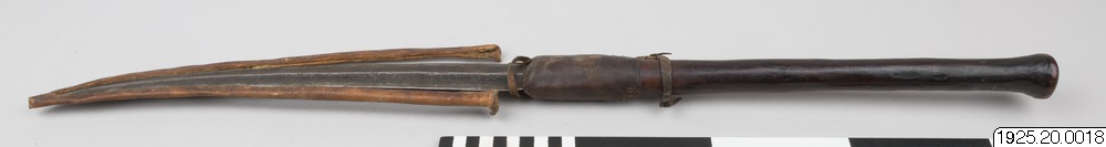 Kniv. För elefantjägare. Klingan tveeggad/ svagt böjd, förstärkt med en åsformig upphöjning längs mitten på ömse sidor. Egg-skyddare av läder (se n:r 8-10 och 15-16). Långt träskaft med läderklätt fäste vid knivens bas. En läderrem över hanleden. L. 76.5 cm., varav klingan 37 cm. Klingans största bredd 42 mm., tjockl. över åsarna 7 mm. - En dylik kniv avbildad i Kmunke, Zueer durch Uganda