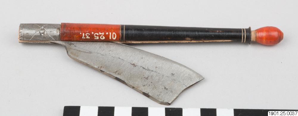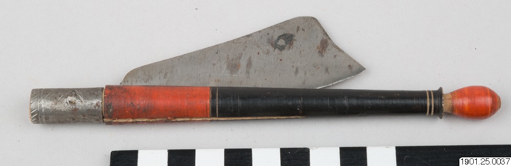 • Rakkniv med skaft av rött och svartmålat trä.
