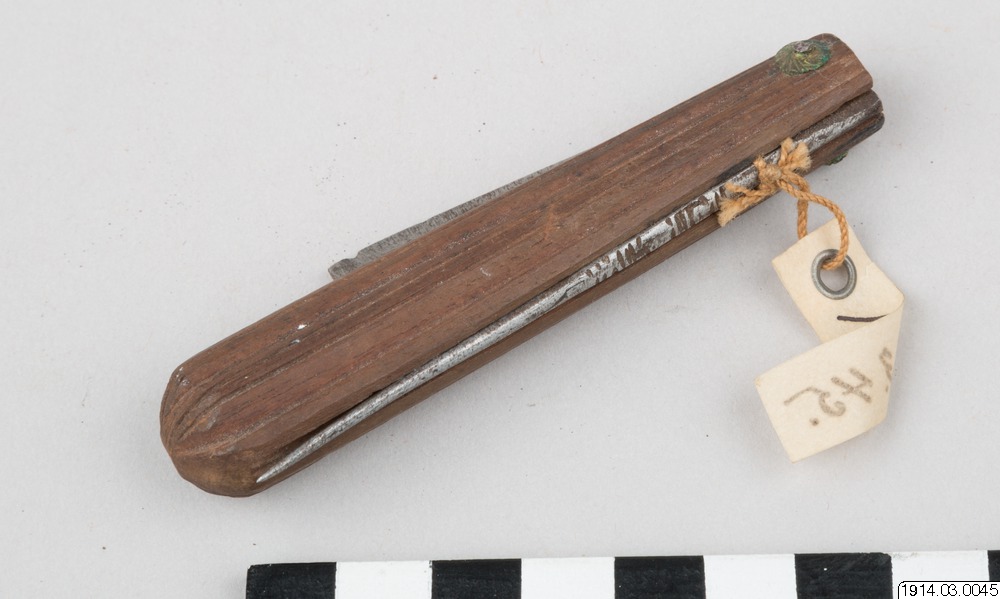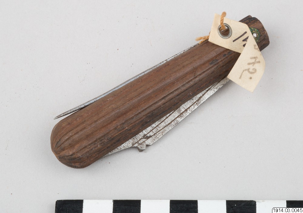 • brukas vid skrivande på palmblad. Dessa skäras till med knivbladet, varefter man skriver med den sylliks järnspets, som är infälld i handtagets rygg. [ocr]