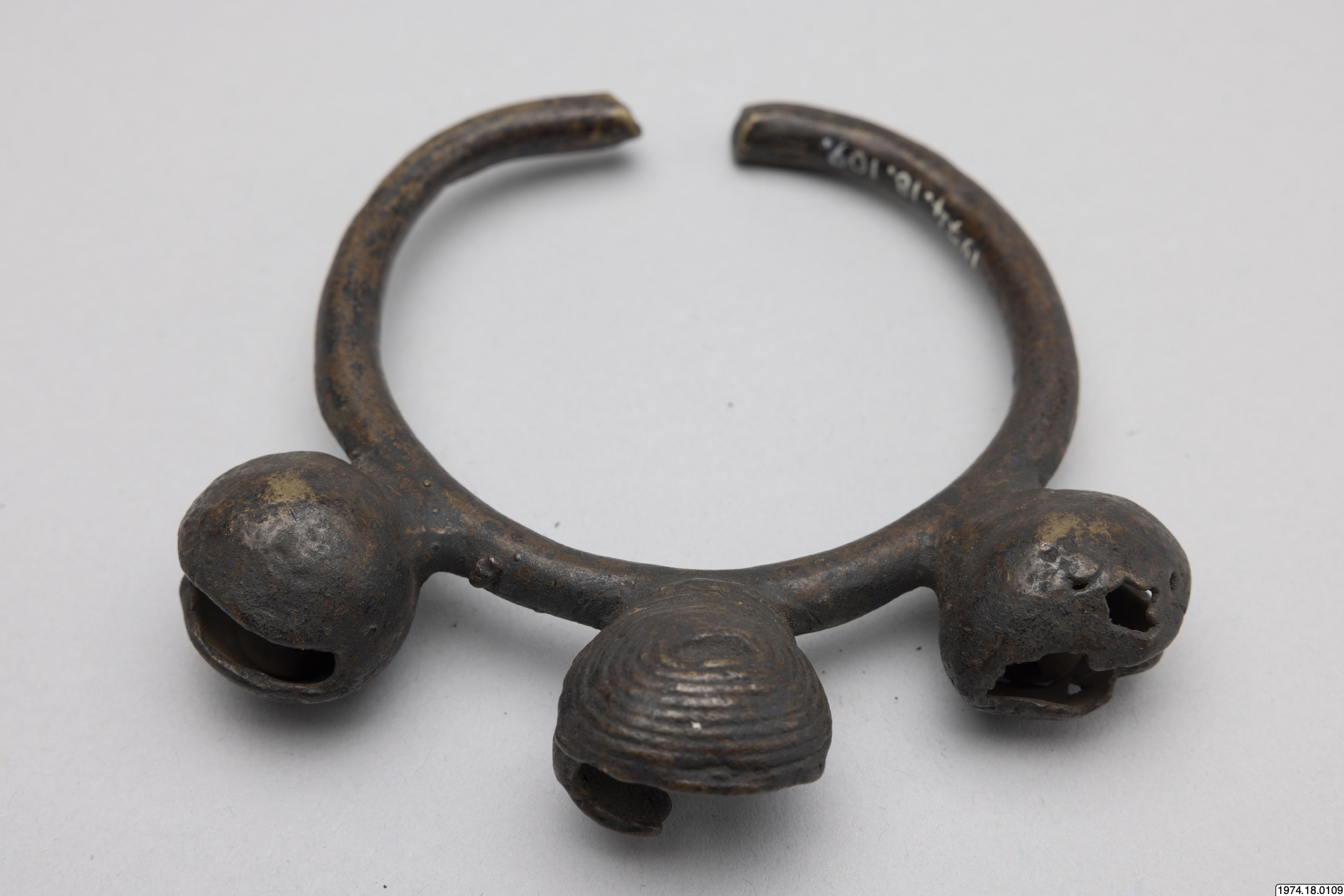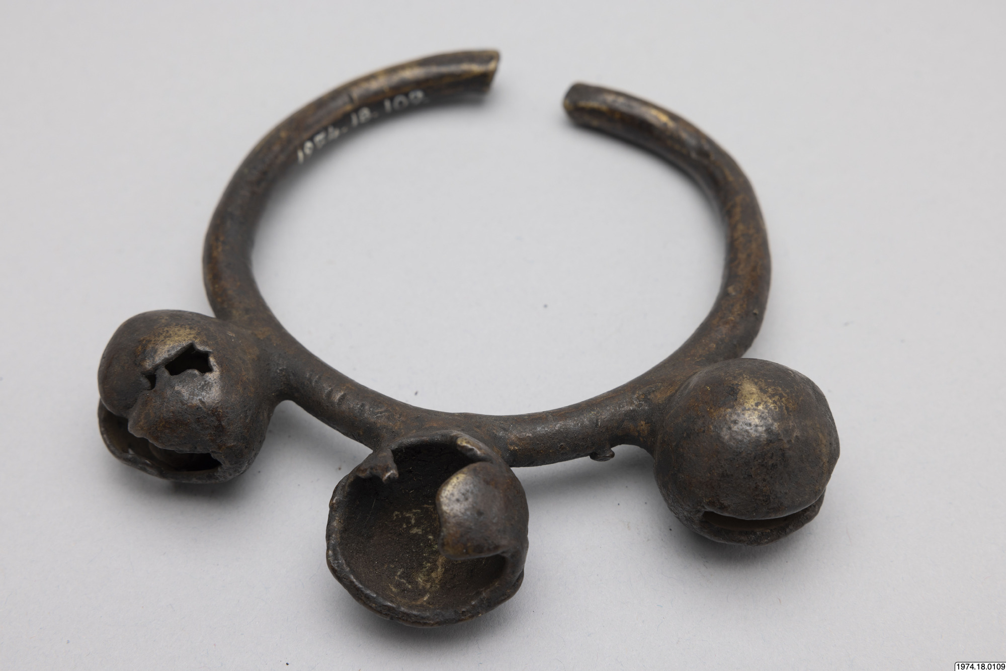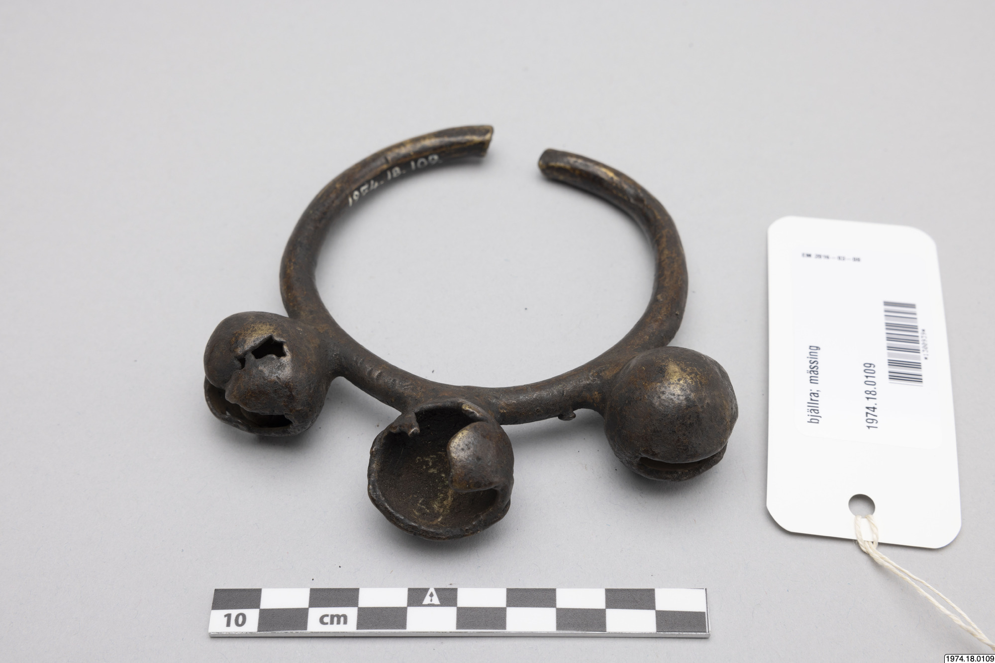 • bjällror i ring. RIng med tre bjällror. I mässing. Den mittre bjällran är trasig och saknar den lilla kulan.