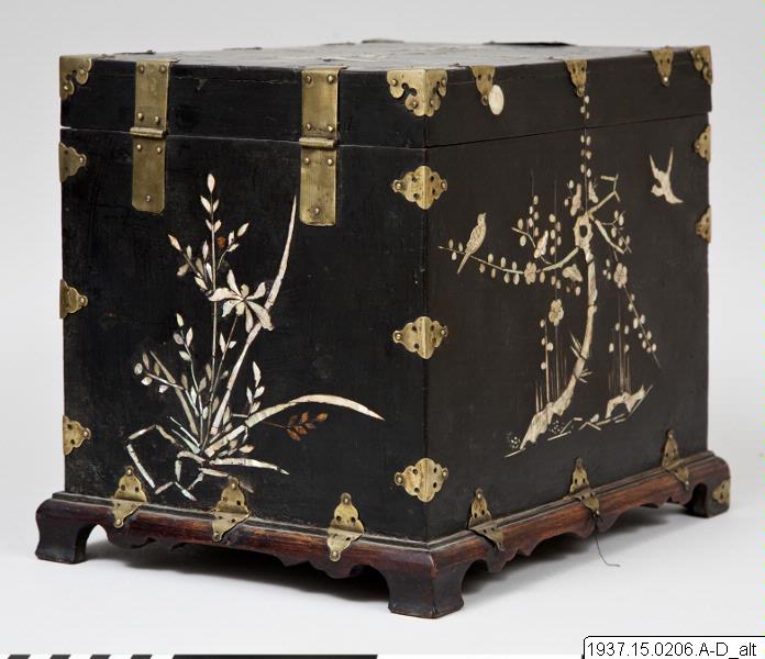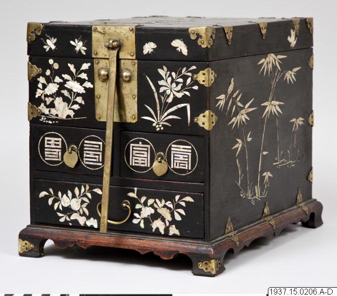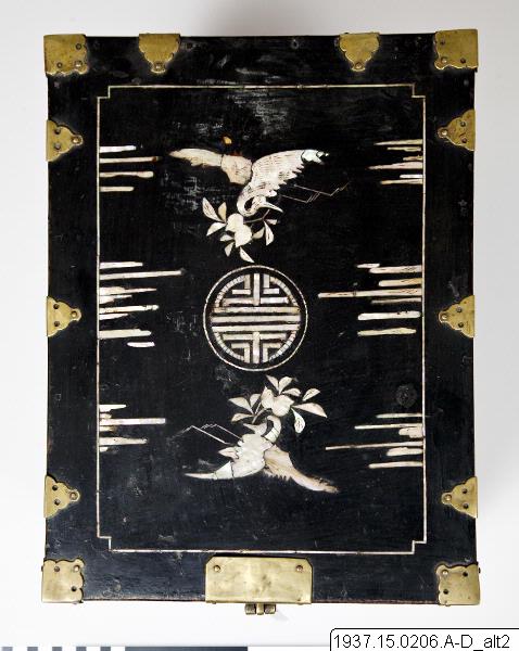 Skrin av trä (A), svartlackerat med blom- och fågelmönster av infälld pärlemor. Toppen går att öppna som en kista. På ena kortsidan finns tre lådor, en större (B) och två mindre (C-D).