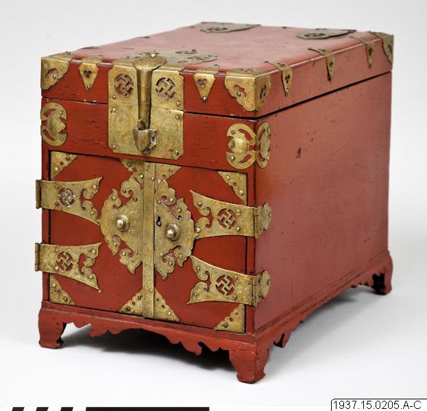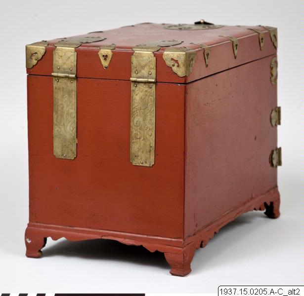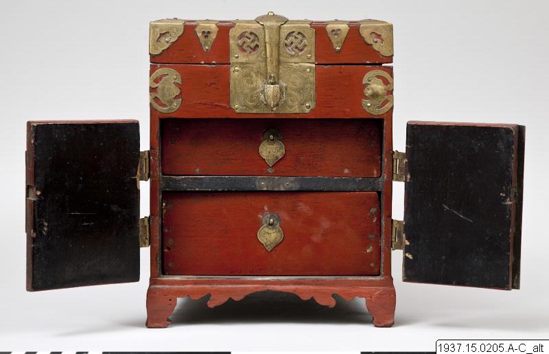 • Litet rödlackerat skåp (A) med två utdragbara lådor inuti (B-C), en låda med uppfällbart lock upptill. Utanpå mässingsbeslag.