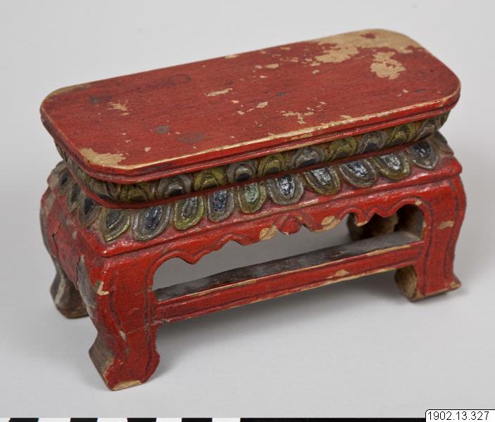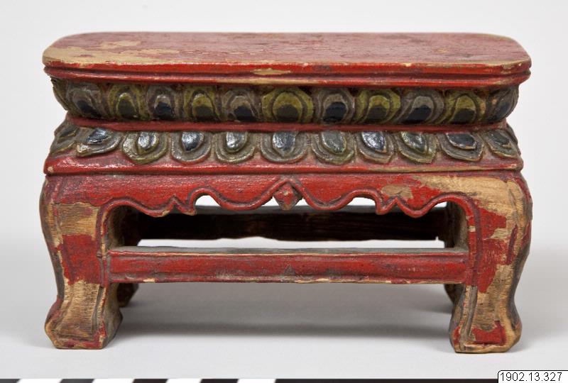 • Miniatyrbord av trä. Troligen använt som underlag för en gudabild. Rektangulär form, fyra svängda ben. Överdelen en dubbel lotustron. Målat rött med lotusbladen i grönt, grått och blått. (Enligt generalkatalogen).