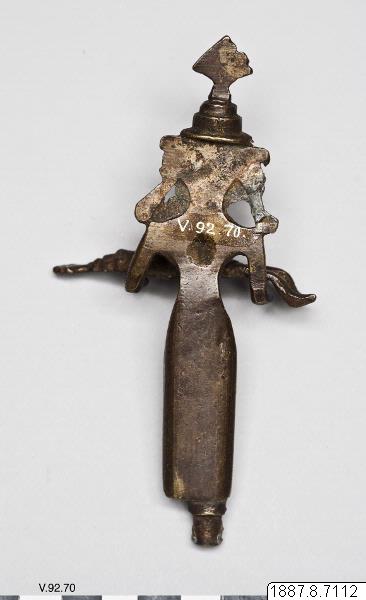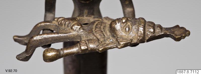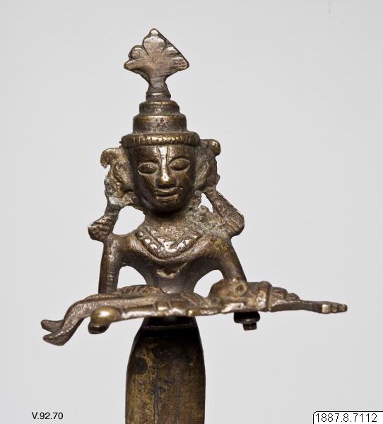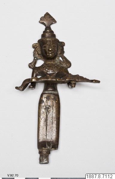 Skulptur av mässing. En basuedo, hörande till en piyala. (Enligt generalkatalogen). En figur håller en annan figur i armarna (Krishnas far, Vasodéo, med Krishna i armarna). Ett rör i botten för att sätta fast skulpturen.