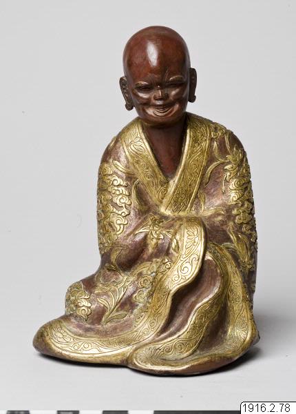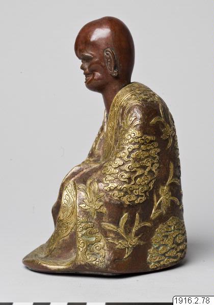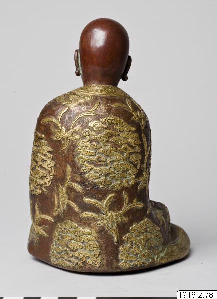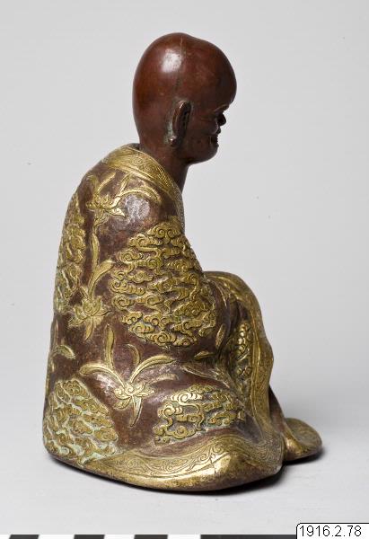 • Skulptur av brons, delvis förgylld. Enligt katalogen en Arhat, kinesisk (på kinesiska Lohan). Sittande man insvept i ett böljande plagg. Brunlackerad.