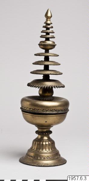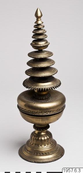 • Relikgömma av mässing. Skål med lock, på hög fot. Ovanpå locket en spira med sju avsatser, överst en spets.